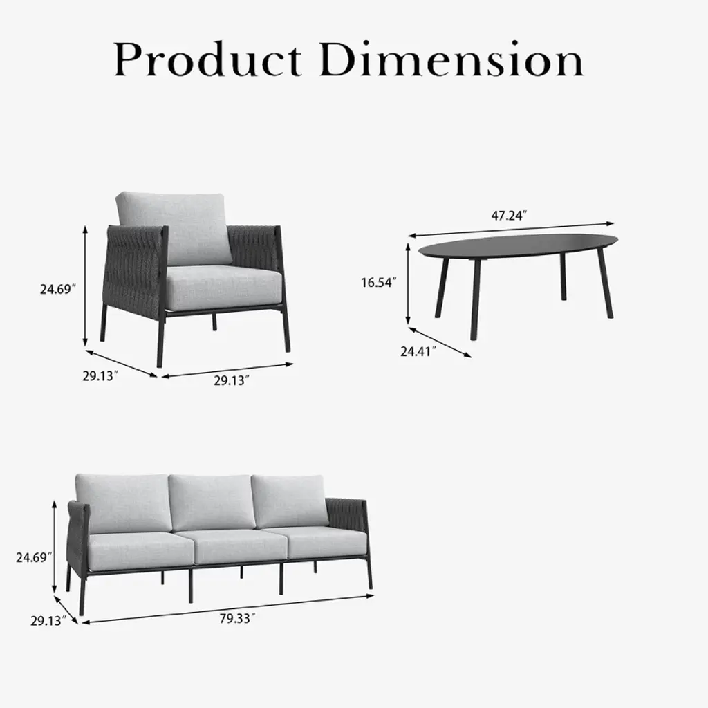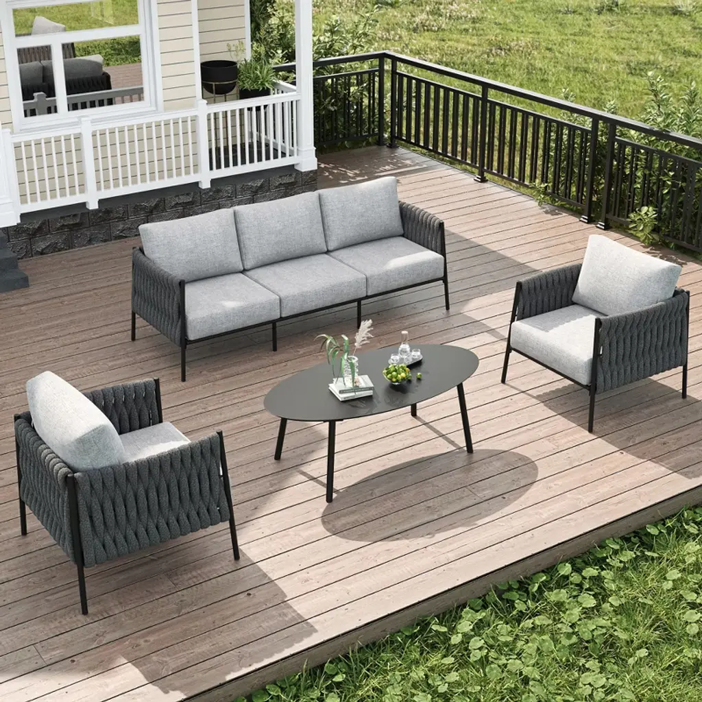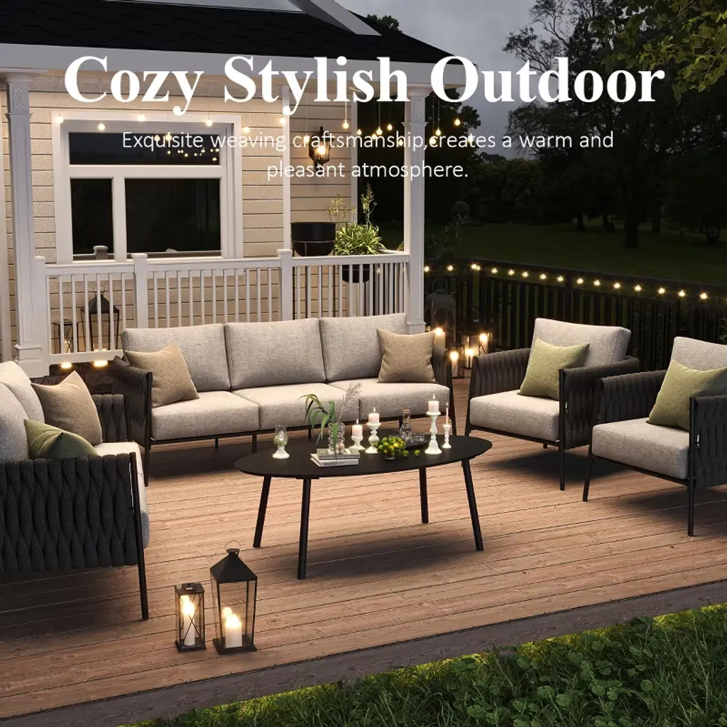 This stunning rope-woven patio set brings a touch of modern elegance to your outdoor oasis. The widened olefin rope, meticulously hand-woven over durable, powder-coated metal frame, creates captivating visual texture and sense of sophisticated style. Relax on deep and wide sofa, propped against 6 inches cushion of elastic foam that's perfect for outdoor relaxation. The easy-clean materials ensure effortless maintenance, allowing you to focus on enjoying the beauty and tranquility of your outdoor space.