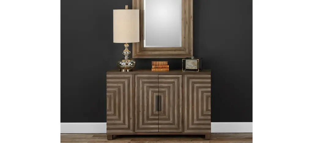Geometric parquetry style console, with rustic two-toned fir veneer and old iron bar polyurethanells. Center portion opens to, two, fixed interior shelves.