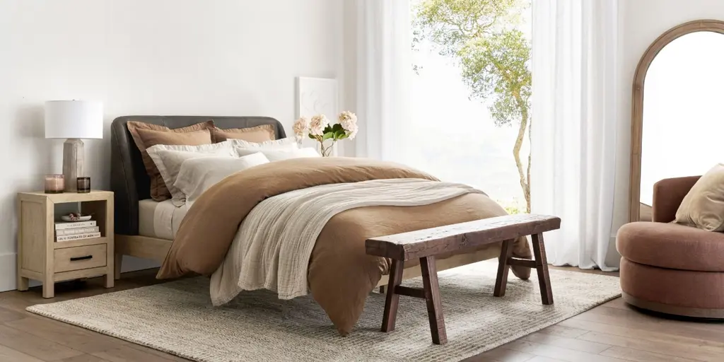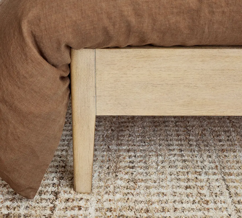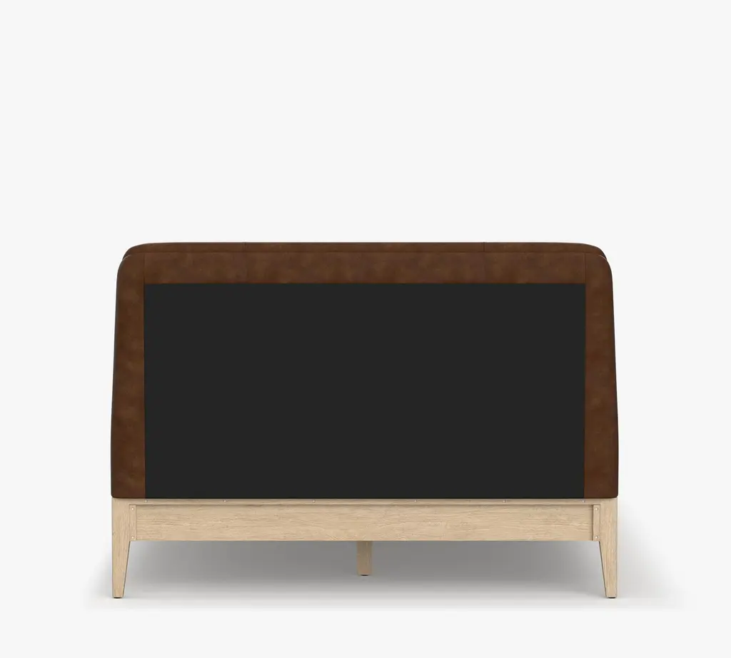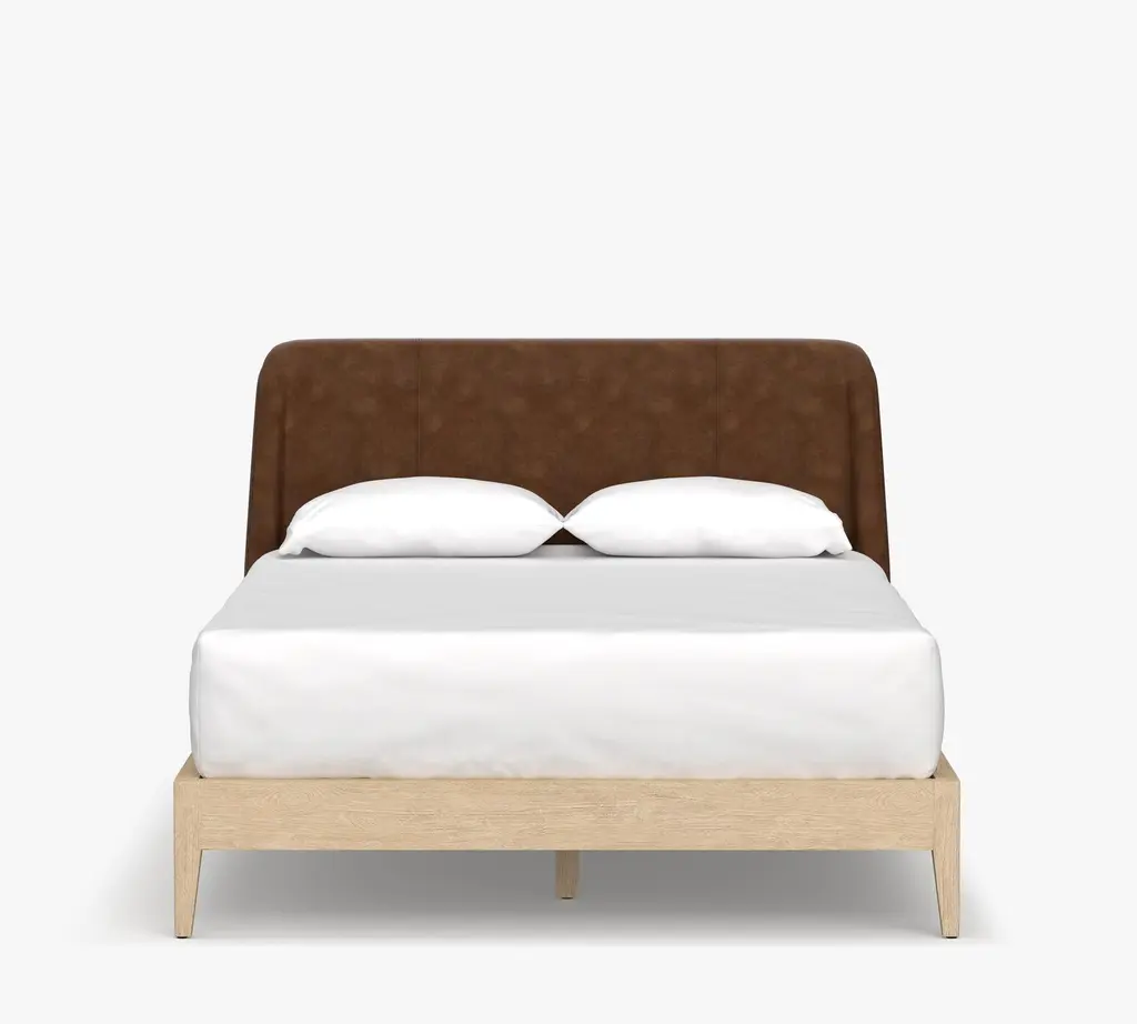 Relaxed but refined, Layton balances the crisp, tailored look of perfectly fitted leather upholstery with the rustic warmth of wooden legs. We updated a traditional shelter headboard, giving it shallow, tapering curves that add a dreamy feel, perfect for lingering and lounging in bed.