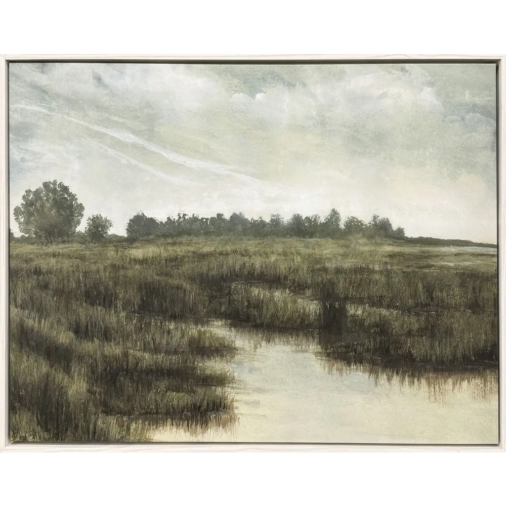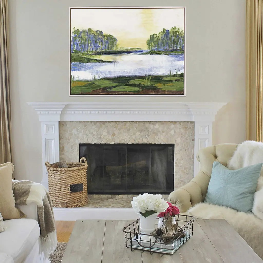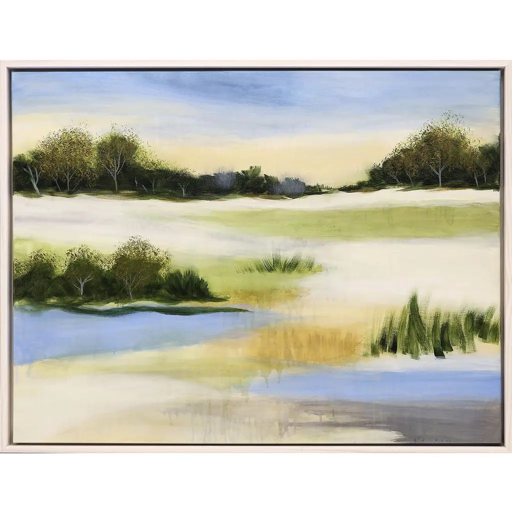 Exclusive hand painted canvas. Hand stretched and mounted in a whitewash wood floater frame.
