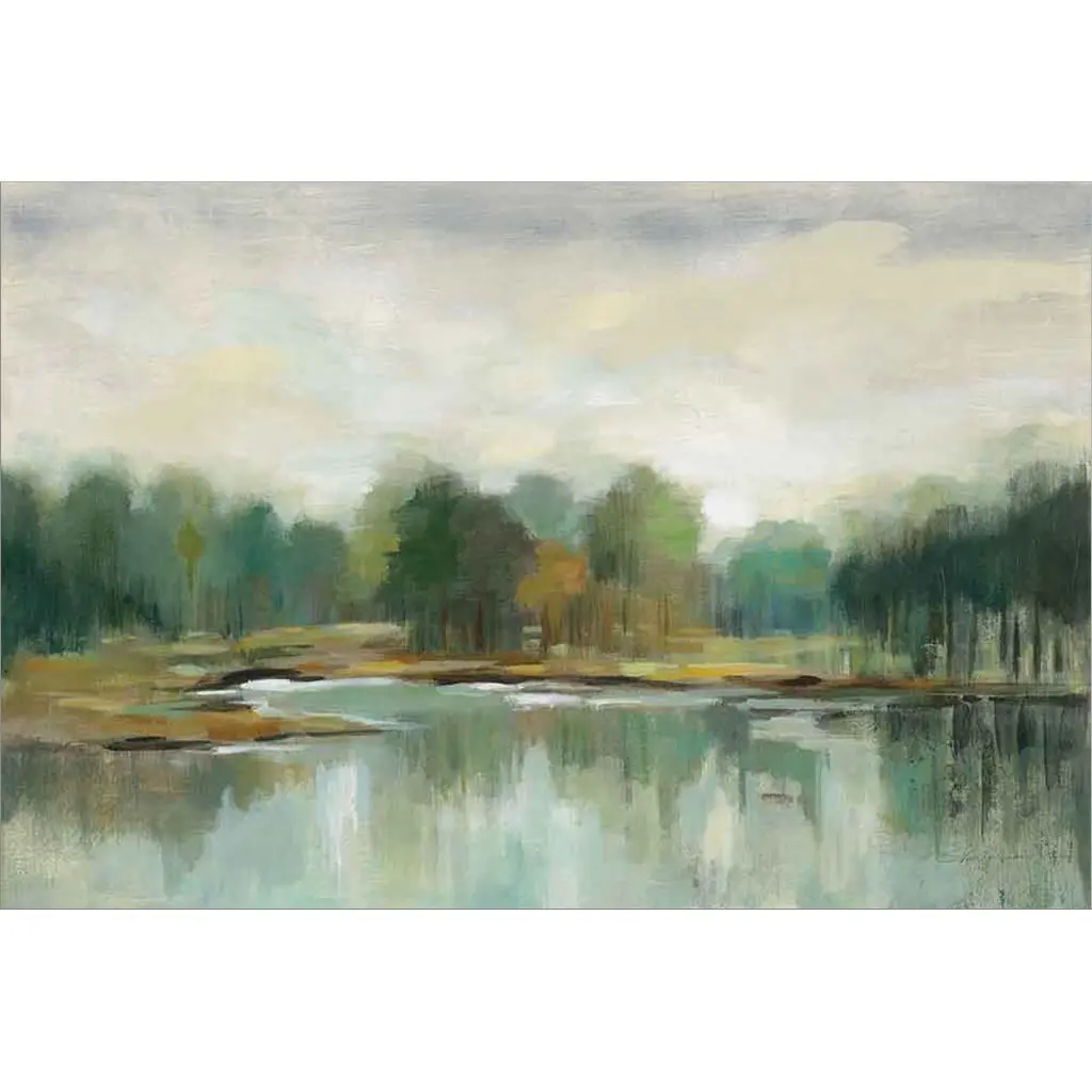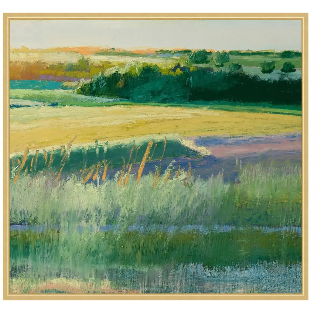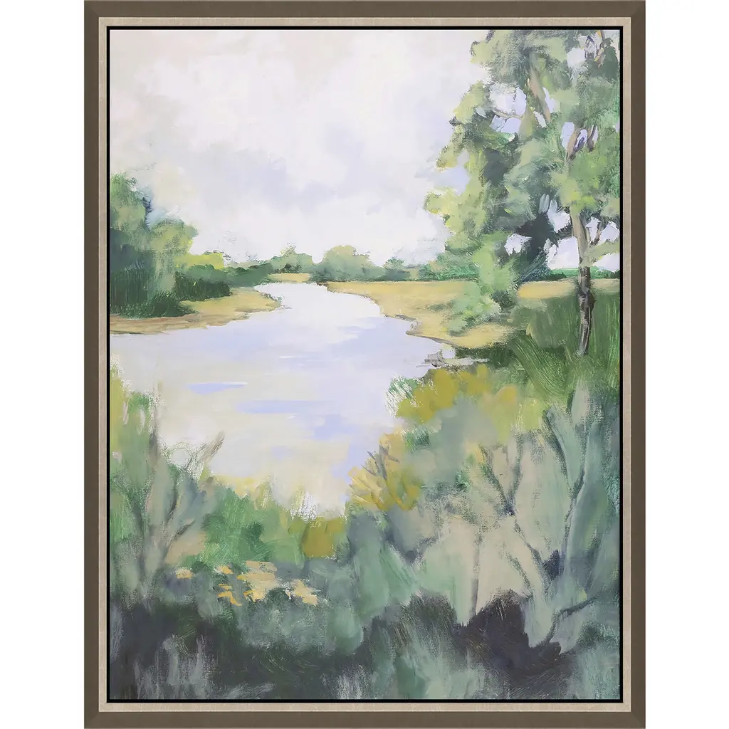 Exclusive hand painted canvas. Hand stretched and mounted in a whitewash wood floater frame.