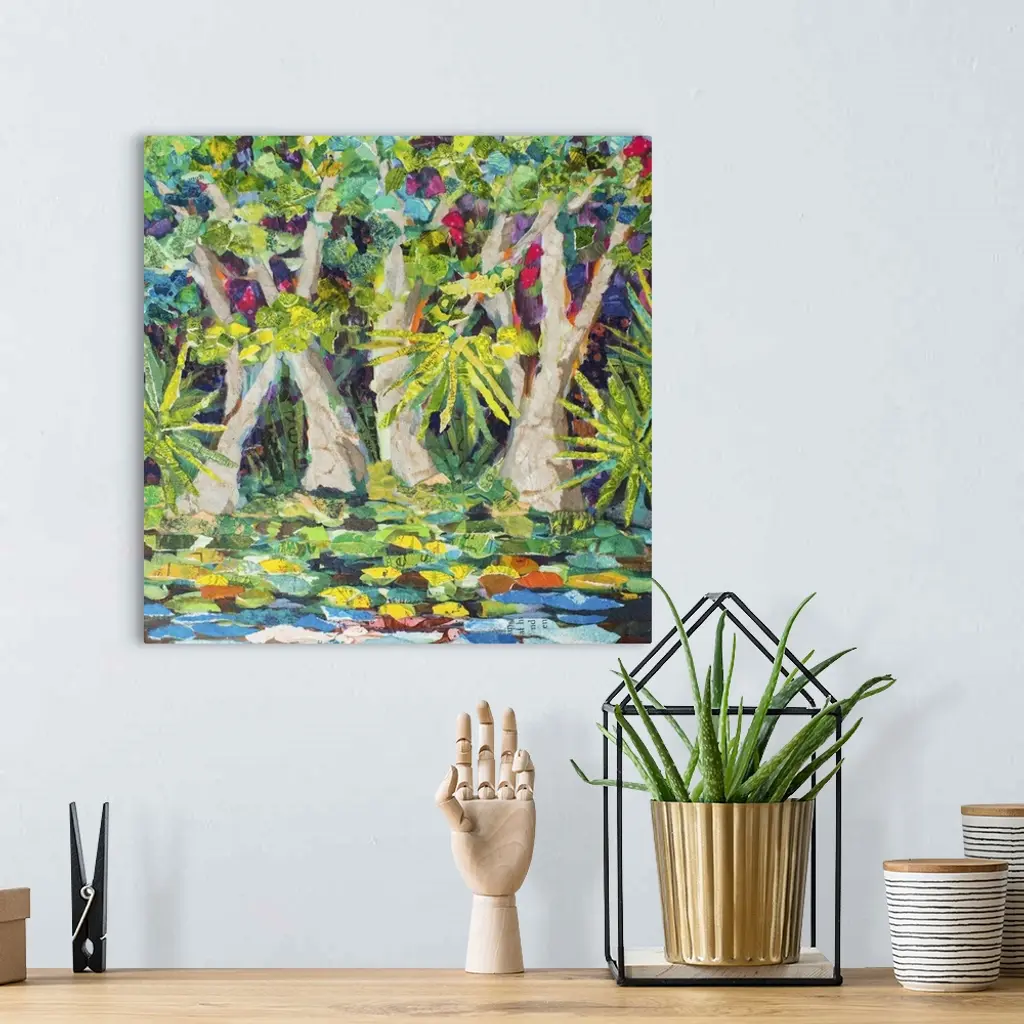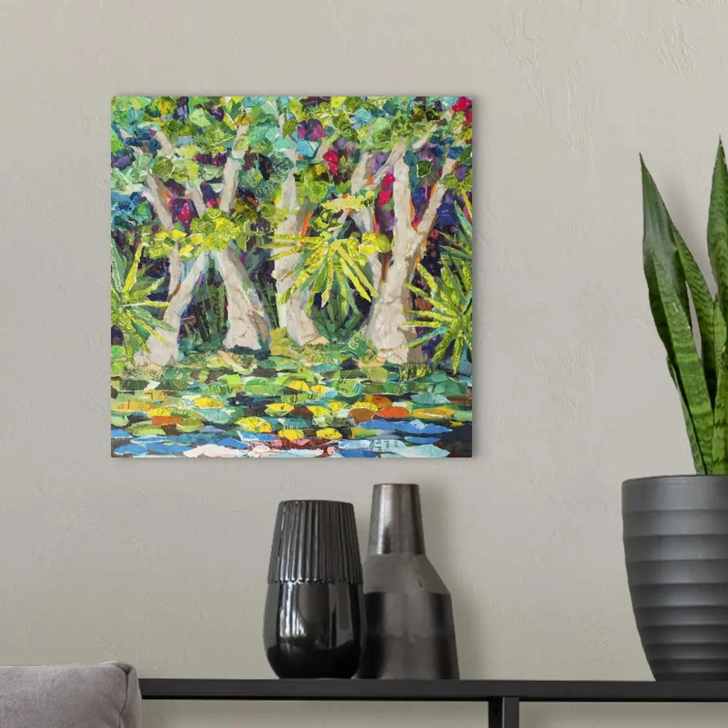 Bright contemporary art of tropical trees along the Wekiva River in Florida, with colorful leaves and flowers.