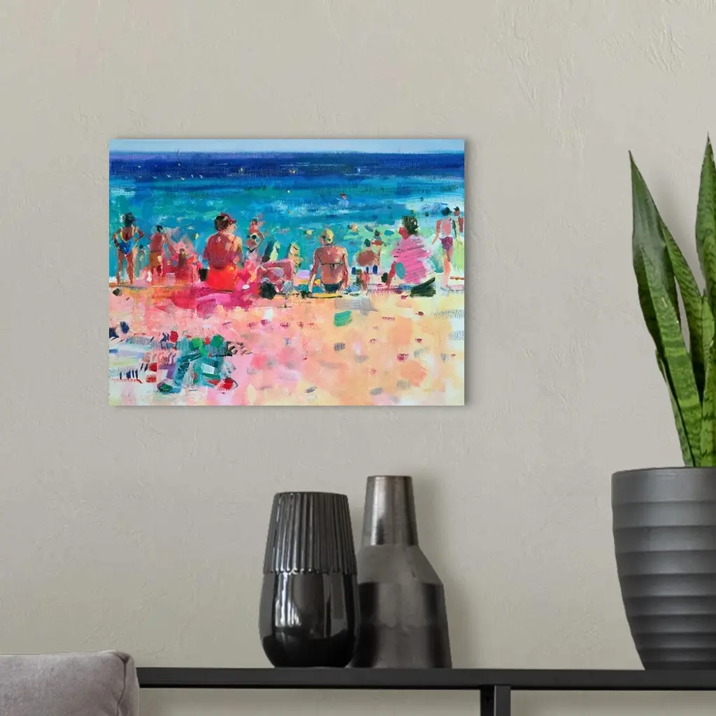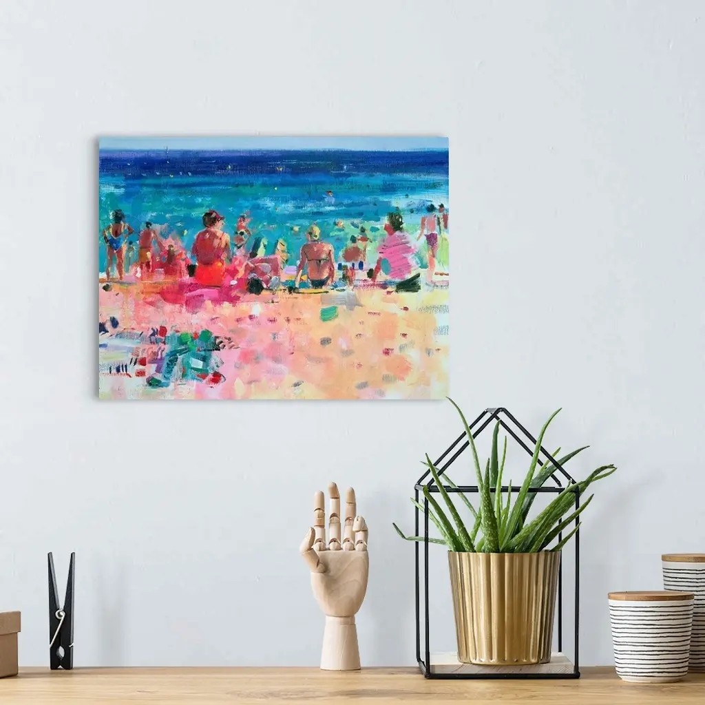 Large wall art of a crowded beach with people tanning on the sand as well as people swimming in the water.