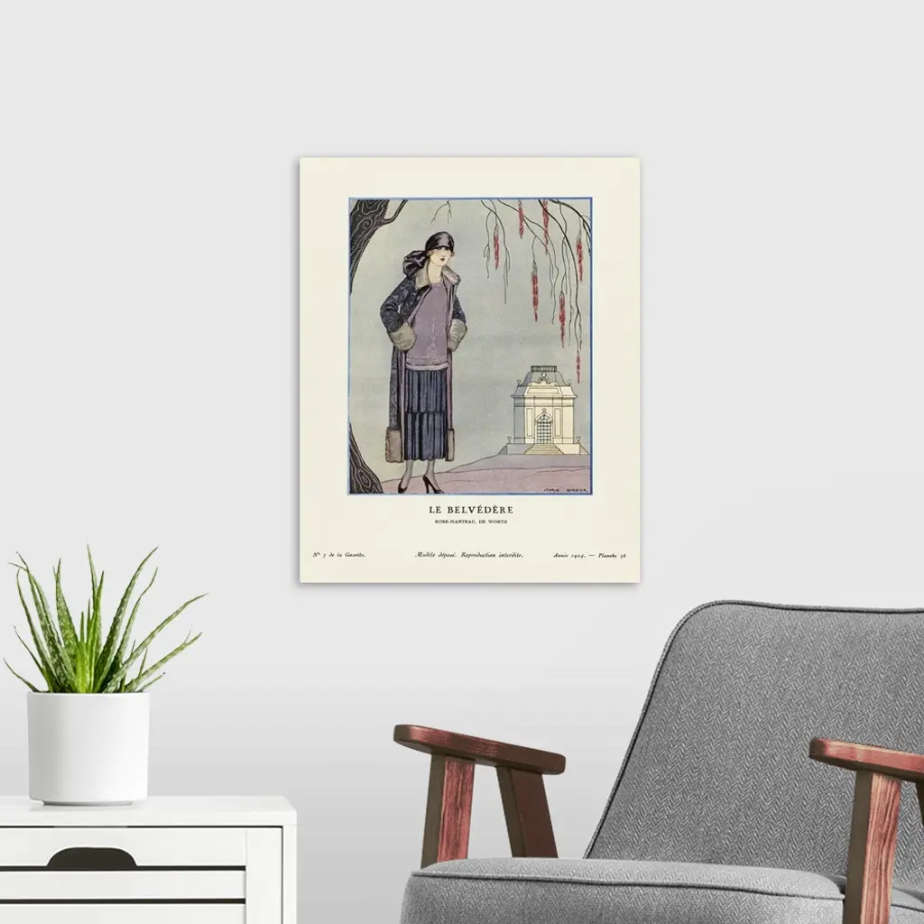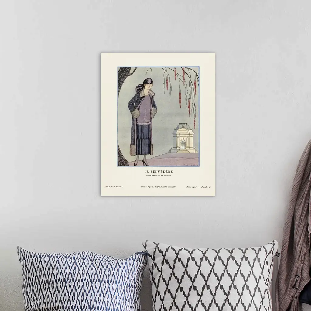 Le Belvedere. The Belvedere. Robe-manteau, de Worth. Dress-coat by Worth. Art-deco fashion illustration by French artist George Barbier, 1882-1932. The work was created for the Gazette du Bon Ton, a Parisian fashion magazine published between 1912-1915 and 1919-1925.