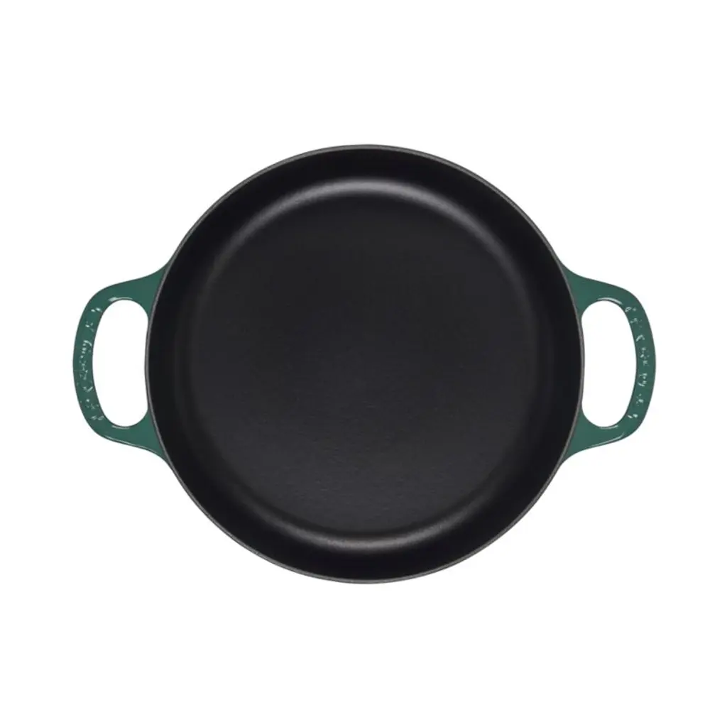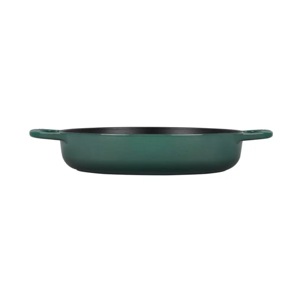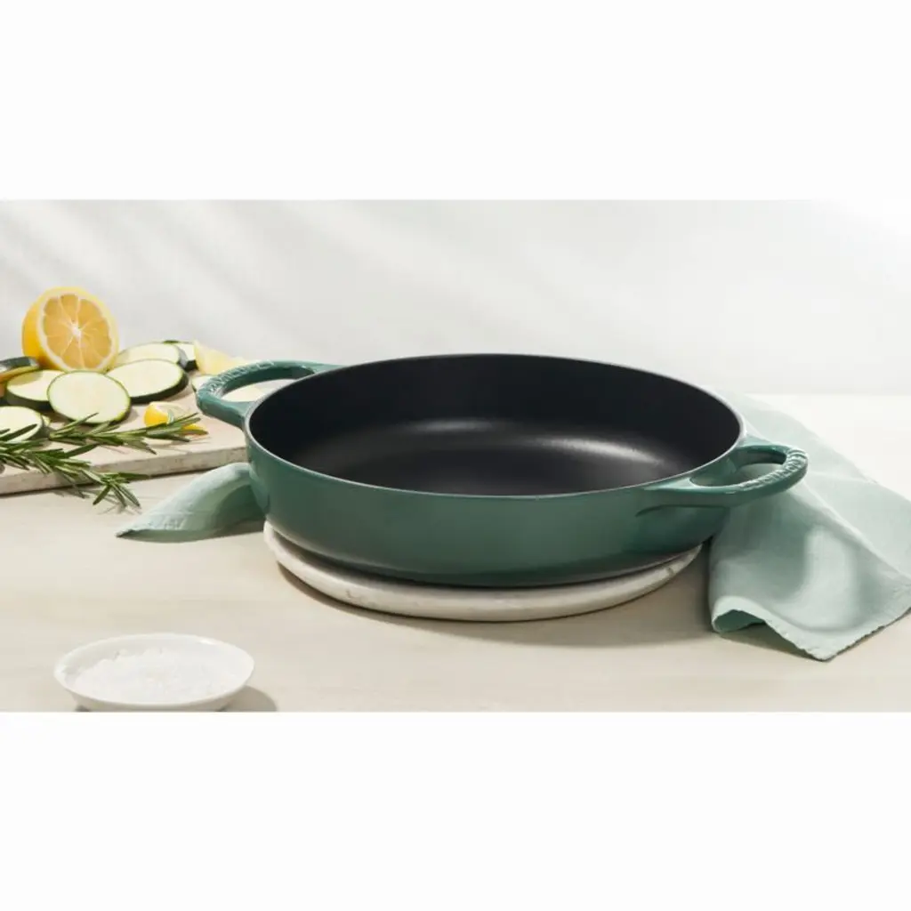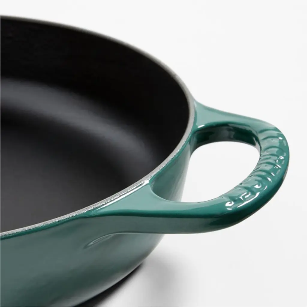 Enamel in deep green glazes the everyday pan's exterior, while the interior boasts a low-maintenance black satin finish that develops a virtually non-stick patina. Along with its wide cooking surface, the pan also offers a generous depth and subtly curved sides that make it easy to stir and flip. Le Creuset's coveted cast iron distributes heat evenly, requires no seasoning and stands up to metal utensils. Ideal for roasting, frying, simmering and more, the versatile pan goes effortlessly from stove to oven to table.Revered by both professional chefs and home cooks since its 1925 debut, Le Creuset's classic French cookware is prized for its utilitarian beauty and unsurpassed heat retention.