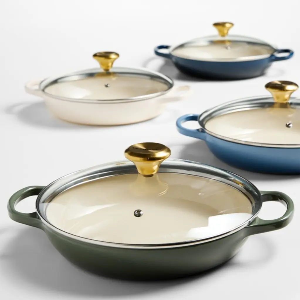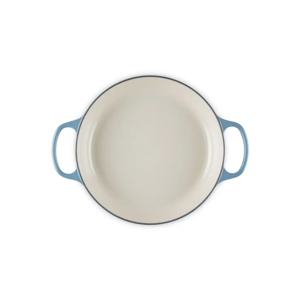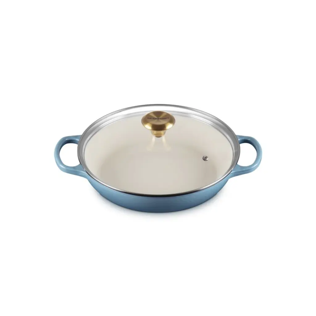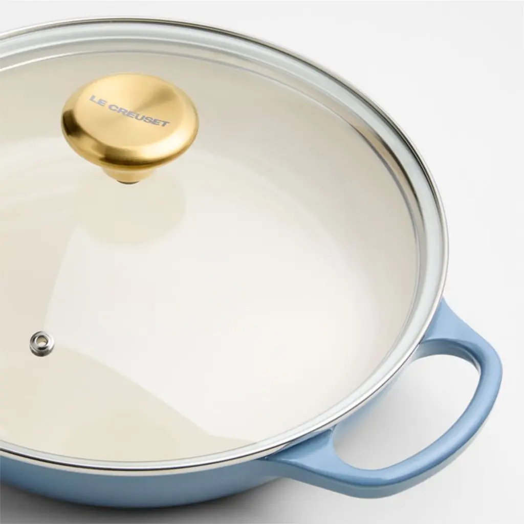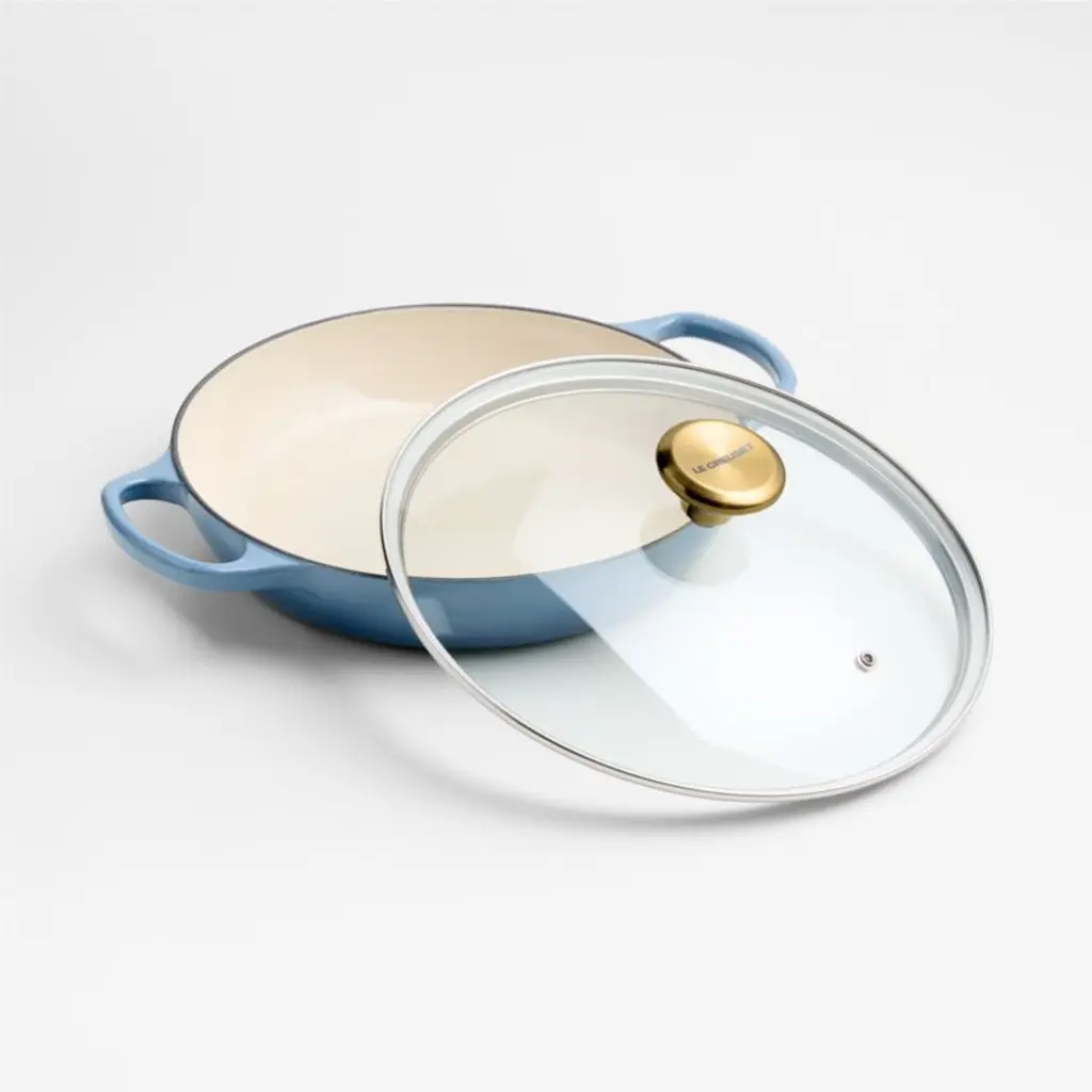 Curated for us exclusively, this gorgeous shade of blue is as casual and chic as your favorite pair of jeans. The creamy chambray blue enamel coating is not only beautiful, it also ensures that the cast iron braiser pan is impervious to acid, alkali, odors and stains (no seasoning required). Topped with a gleaming gold-finished knob, the tight-fitting glass lid creates a blanket of heat for even cooking, ideal for braising meats or vegetables and keeping casseroles or baked goods warm (and keeping an eye on your recipe's progress). This versatile pan goes effortlessly from stove to oven to table for an always-in-style presentation of short ribs, baked farro or blueberry crumble.Revered by both professional chefs and home cooks since its 1925 debut, Le Creuset's classic French cookware is prized for its utilitarian beauty and unsurpassed heat retention.