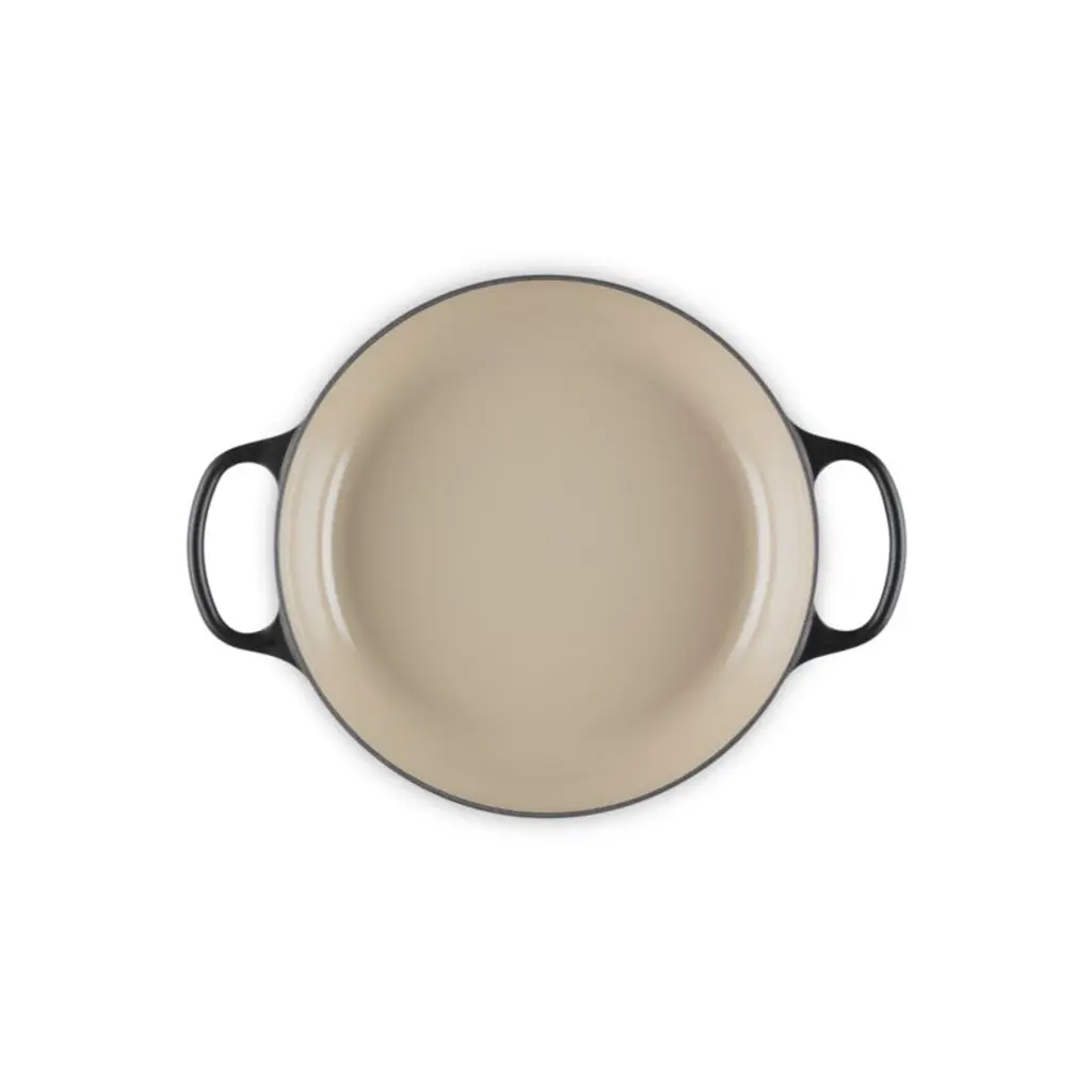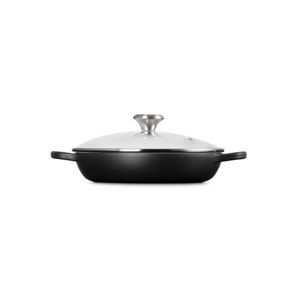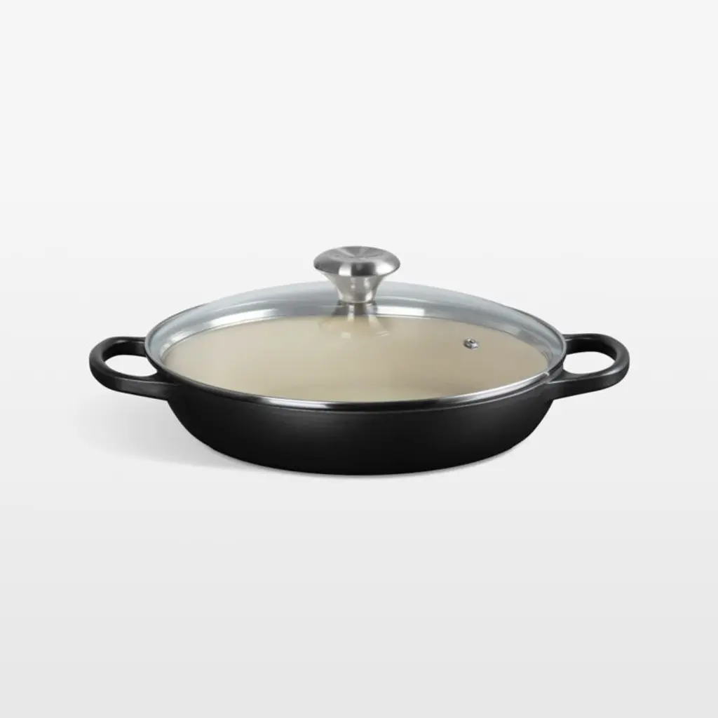 Clad in durable matte black enamel inspired by licorice, this cast iron braiser is impervious to acid, odors and stainsand requires no seasoning. The tight-fitting glass lid creates a blanket of heat for even cooking, ideal for braising meats or vegetables and keeping casseroles or baked goods warm (and keeping an eye on your recipe's progress). This versatile pan goes effortlessly from stove to oven to table for a timeless presentation of short ribs, cabbage or blackberry crumble.Revered by both professional chefs and home cooks since its 1925 debut, Le Creuset's classic French cookware is prized for its utilitarian beauty and unsurpassed heat retention.
