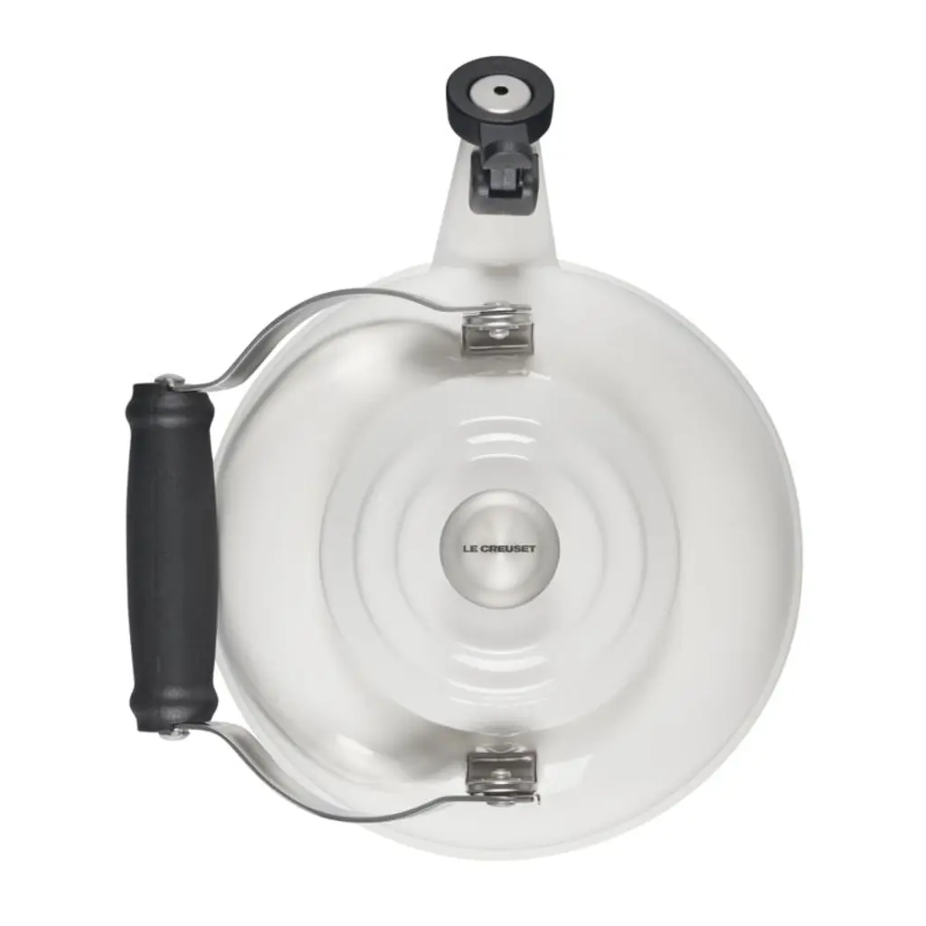 Enameled in classic white, this whistling kettle from Le Creuset adds a touch of contemporary style to the stovetop. The kettle's wide base size allows for quick heating with superior heat distribution, with a single-tone whistle that let's you know when the water's come to a rolling boil.