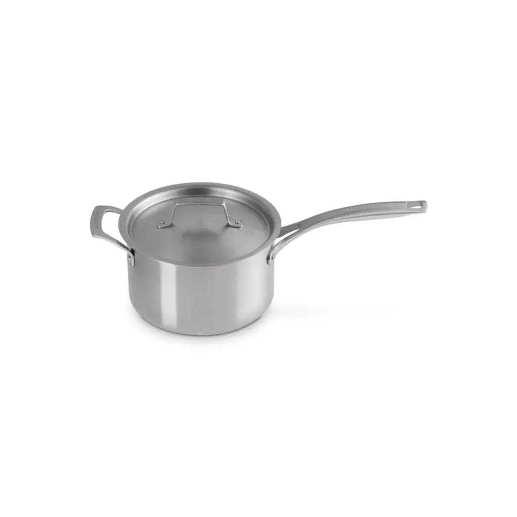 New essential cookware from Le Creuset. Crafted with a focus on hardworking versatility, this saucepan excels at simmering, stewing and cooking sauces. Non-reactive stainless steel with a brushed finish shapes the covered pan. The aluminum core ensures even heat distribution, while the lid traps moisture and heat. Fitted with a comfortable, stay-cool handle, this essential saucepan goes from stove to oven to dishwasher for worry-free weeknight and special-occasion cooking.