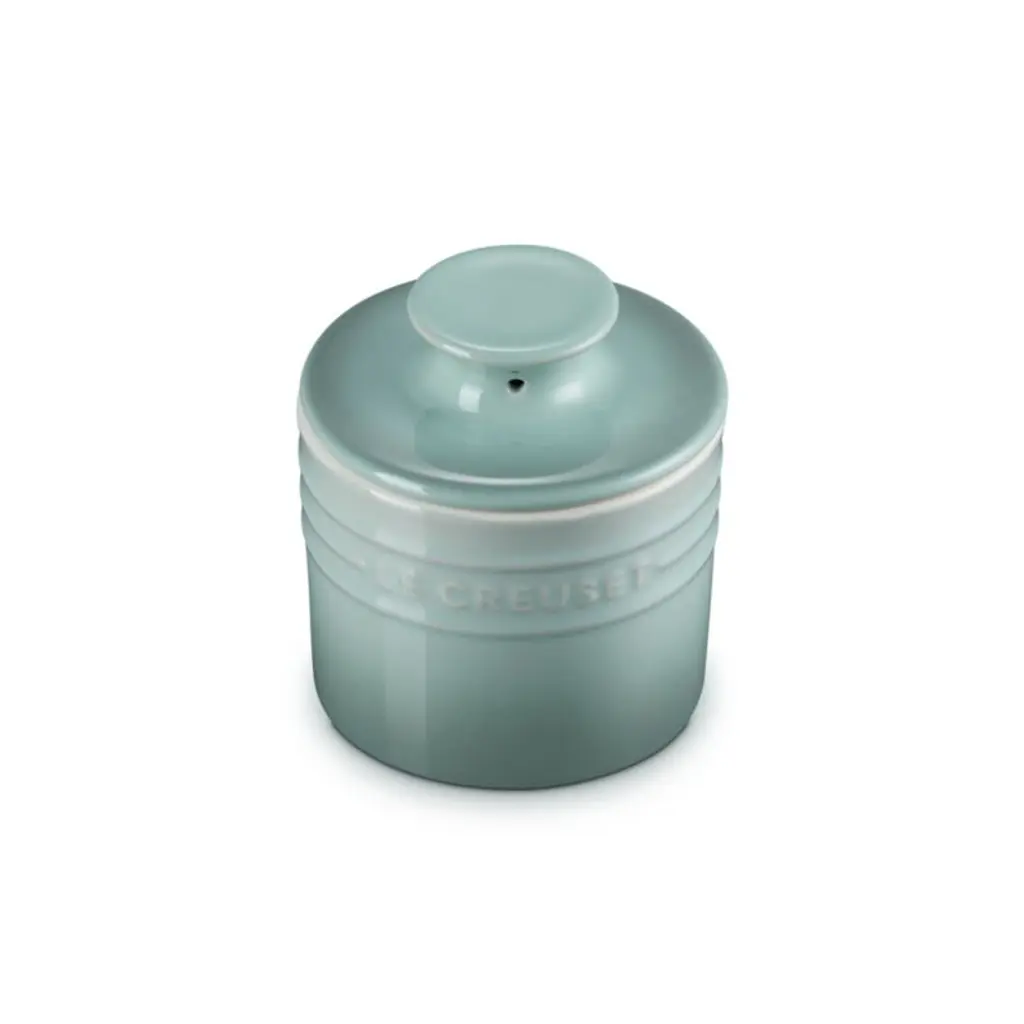 Glazed a serene blue-grey-green inspired by sea salt, this stoneware butter keeper safely keeps butter at room temperature and ready for spreading. The durable porcelain enamel stands up to metal butter knives and spreaders, resisting chips, scratches and stains. Coordinating with Le Creuset's timeless cookware and bakeware, the airtight crock stores butter beautifully on the countertop and makes for a charming presentation on the dining table or buffet.