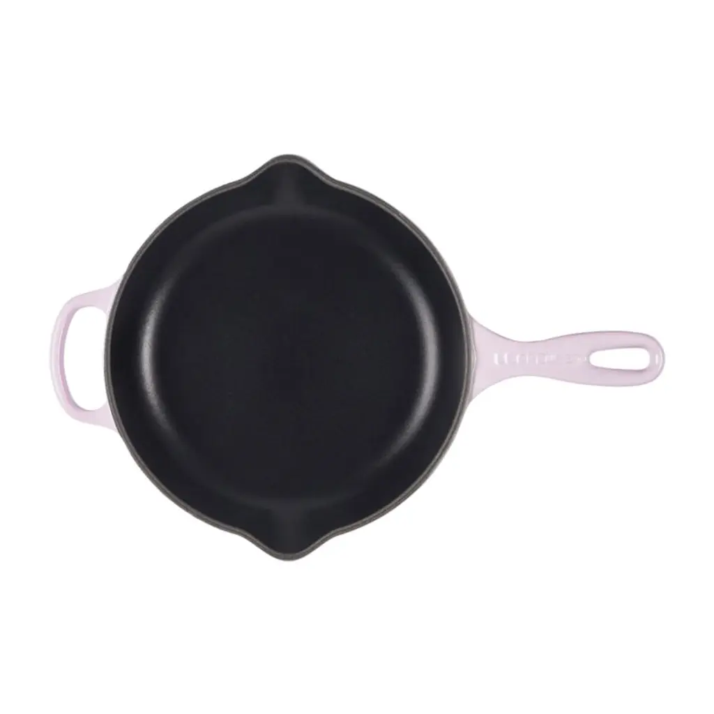 Creamy enamel in creamy blush-purple inspired by shallots coats this cast iron skillet with a smooth, shock-resistant finish, making it impervious to acid, alkali, odors and stains. Formulated to work with higher temperatures, the black non-reactive cooking surface does not require seasoning. Use this frying pan to brown Brussels sprouts, fry eggs and bake pizza.Revered by both professional chefs and home cooks since its 1925 debut, Le Creuset's classic French cookware is prized for its utilitarian beauty and unsurpassed heat retention.