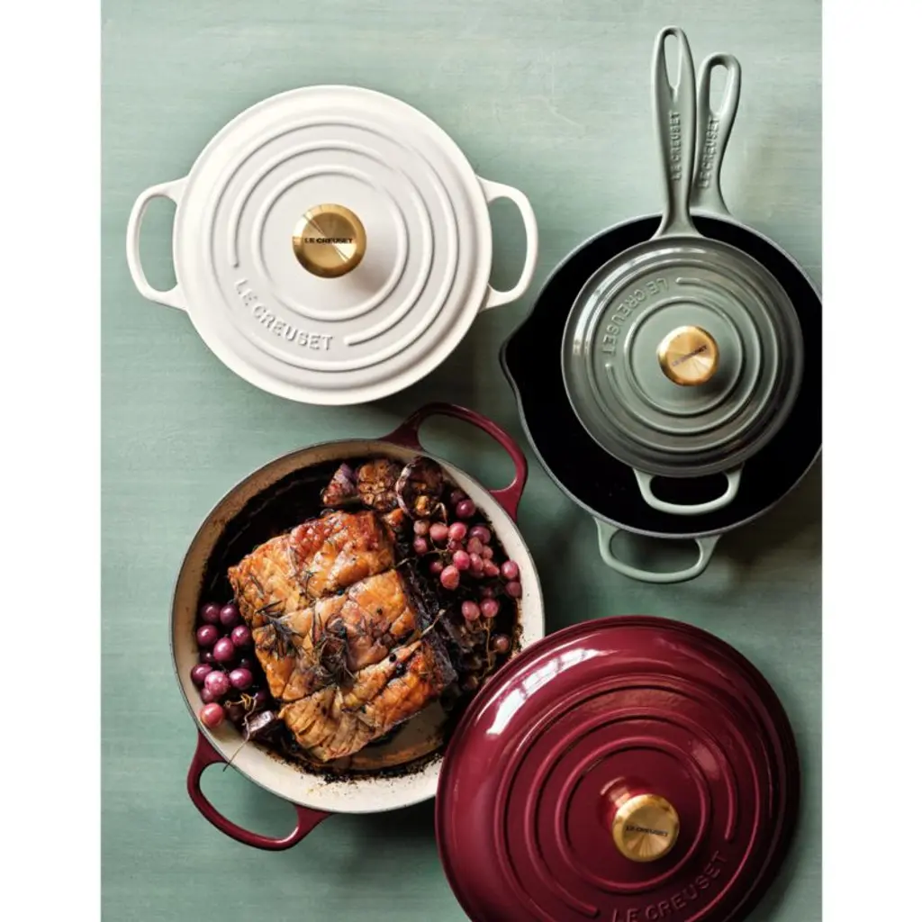 A fresh, earthy new hue inspired by thyme, exclusively at Crate & Barrel. Enamel in warm grey-green glazes this cast iron skillet with a smooth, shock-resistant finish, making it impervious to acid, alkali, odors and stains. The non-reactive cooking surface does not require seasoning, and the pan is compatible with all types of heat sources, from gas and induction stoves to outdoor grills. Use this display-worthy skillet to brown onions, sear pork chops and bake clafoutis.Revered by both professional chefs and home cooks since its 1925 debut, Le Creuset's classic French cookware is prized for its utilitarian beauty and unsurpassed heat retention.