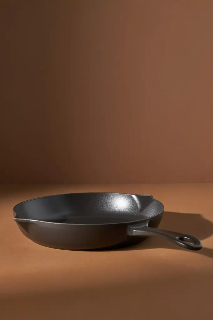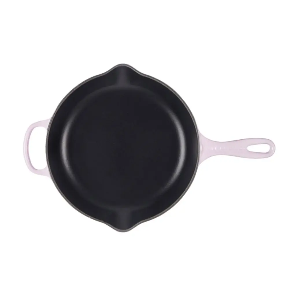 Creamy enamel in creamy blush-purple inspired by shallots coats this cast iron skillet with a smooth, shock-resistant finish, making it impervious to acid, alkali, odors and stains. Formulated to work with higher temperatures, the black non-reactive cooking surface does not require seasoning. Use this frying pan to saute asparagus, caramelize onions and fry pancakes.Revered by both professional chefs and home cooks since its 1925 debut, Le Creuset's classic French cookware is prized for its utilitarian beauty and unsurpassed heat retention.