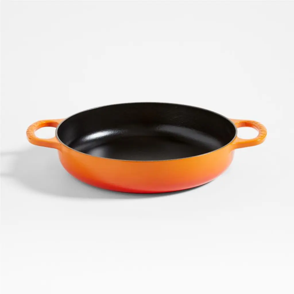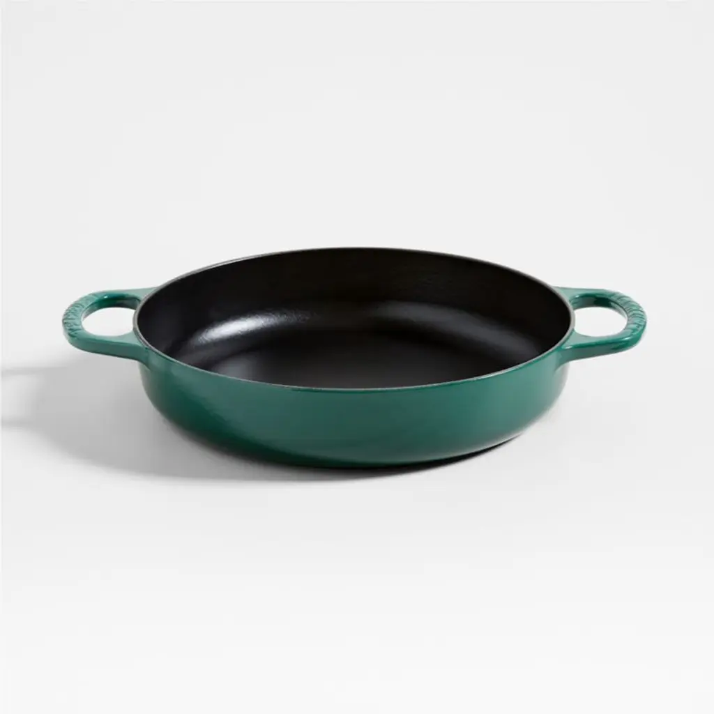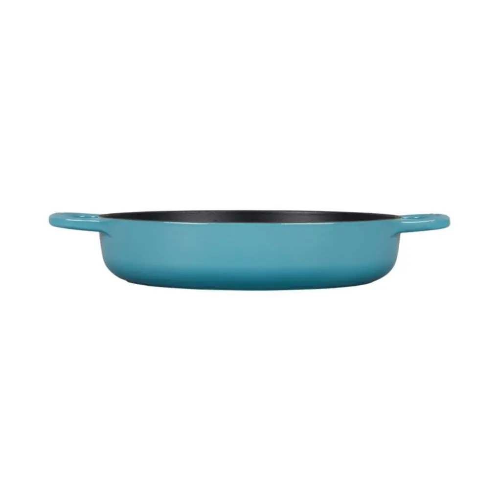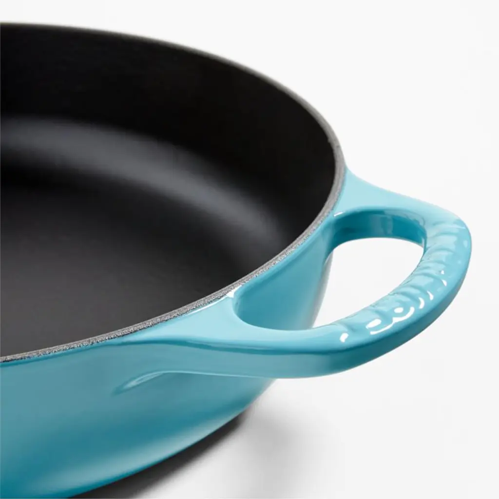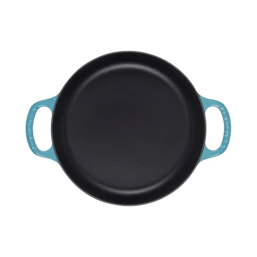 Enamel in vibrant tropical blue inspired by the Caribbean glazes the exterior of our exclusive everyday pan, while the interior boasts a low-maintenance black satin finish that develops a virtually non-stick patina. Along with its wide cooking surface, the pan also offers a generous depth and subtly curved sides that make it easy to stir and flip. Le Creuset's coveted cast iron distributes heat evenly, requires no seasoning and stands up to metal utensils. Ideal for roasting, frying, simmering and more, the versatile pan goes effortlessly from stove to oven to table.Revered by both professional chefs and home cooks since its 1925 debut, Le Creuset's classic French cookware is prized for its utilitarian beauty and unsurpassed heat retention.