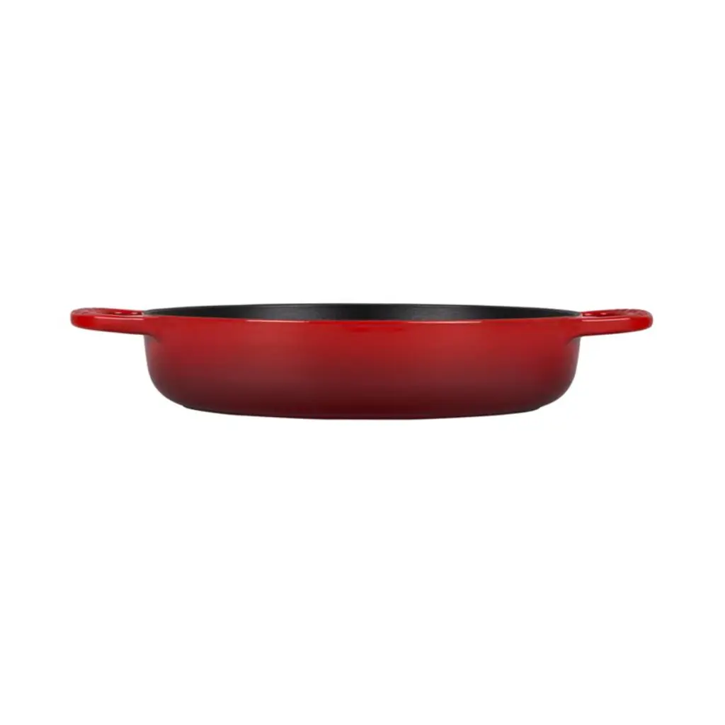 Enamel in rich ombre red inspired by cherries glazes the exterior of our exclusive everyday pan, while the interior boasts a low-maintenance black satin finish that develops a virtually non-stick patina. Along with its wide cooking surface, the pan also offers a generous depth and subtly curved sides that make it easy to stir and flip. Le Creuset's coveted cast iron distributes heat evenly, requires no seasoning and stands up to metal utensils. Ideal for roasting, frying, simmering and more, the versatile pan goes effortlessly from stove to oven to table.Revered by both professional chefs and home cooks since its 1925 debut, Le Creuset's classic French cookware is prized for its utilitarian beauty and unsurpassed heat retention.