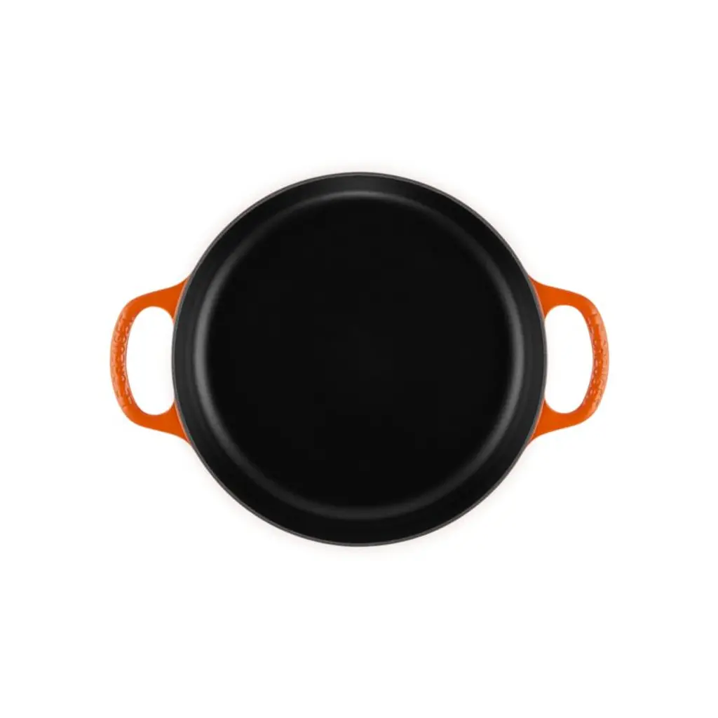 Vibrant red-orange enamel inspired by the raw beauty of molten iron glazes the exterior of our exclusive everyday pan, while the interior boasts a low-maintenance black satin finish that develops a virtually non-stick patina. Along with its wide cooking surface, the pan also offers a generous depth and subtly curved sides that make it easy to stir and flip. Le Creuset's coveted cast iron distributes heat evenly, requires no seasoning and stands up to metal utensils. Ideal for roasting, frying, simmering and more, the versatile pan goes effortlessly from stove to oven to table.Revered by both professional chefs and home cooks since its 1925 debut, Le Creuset's classic French cookware is prized for its utilitarian beauty and unsurpassed heat retention.