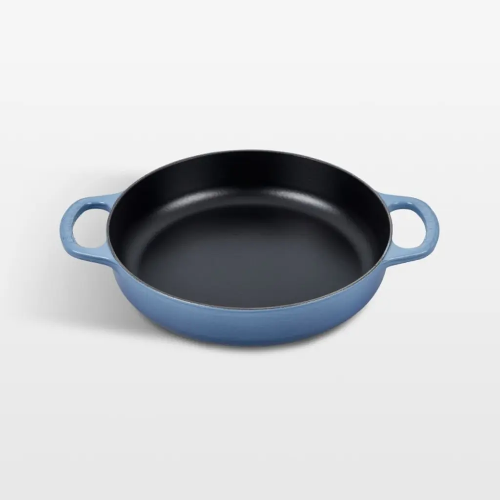 Timeless black enamel glazes the exterior of our exclusive everyday pan, while the interior boasts a low-maintenance black satin finish that develops a virtually non-stick patina. Along with its wide cooking surface, the pan also offers a generous depth and subtly curved sides that make it easy to stir and flip. Le Creuset's coveted cast iron distributes heat evenly, requires no seasoning and stands up to metal utensils. Ideal for roasting, frying, simmering and more, the versatile pan goes effortlessly from stove to oven to table.Revered by both professional chefs and home cooks since its 1925 debut, Le Creuset's classic French cookware is prized for its utilitarian beauty and unsurpassed heat retention.
