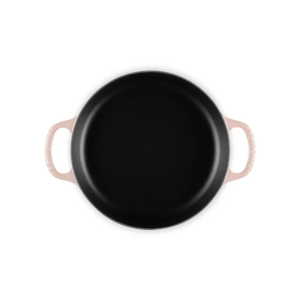 Glossy and glowing Peche enamel inspired by perfectly ripe peaches and effervescent bellinis coats this everyday pan, while the interior boasts a low-maintenance black satin finish that develops a virtually non-stick patina. Along with its wide cooking surface, the pan also offers a generous depth and subtly curved sides that make it easy to stir and flip. Le Creuset's coveted cast iron distributes heat evenly, requires no seasoning and stands up to metal utensils. Ideal for roasting, frying, simmering and more, the rosy coral-hued pan goes effortlessly from stove to oven to table for a summery presentation.Revered by both professional chefs and home cooks since its 1925 debut, Le Creuset's classic French cookware is prized for its utilitarian beauty and unsurpassed heat retention.