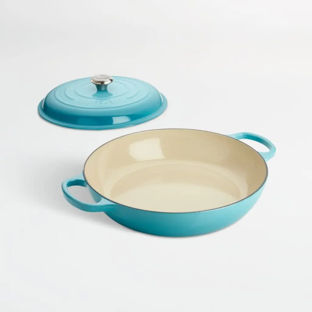 Revered by both professional chefs and home cooks since its 1925 debut, Le Creuset's classic French cookware is prized for its utilitarian good looks and unsurpassed heat retention. In a vibrant tropical blue, this cast iron braiser pan is clad in smooth enamel, rendering each piece impervious to acid, alkali, odors and stains. Designed with double handles for beautiful balance, the everyday pan lends itself to a variety of cooking methods for a wide range of meals. Topped with a stainless steel knob, the close-fitting lid creates a blanket of heat for even cooking, lending itself to braising and keeping foods warm. The rim of each pan has a specially designed "all-round" lip for drip-free pouring with the right or left hand. Non-reactive cooking surface does not require seasoning. Compatible with all types of heat sources, from gas and electric stoves, to ceramic and glass cooktops, to induction and halogen, this braiser pan is perfect for family-size stews, paella or rice.