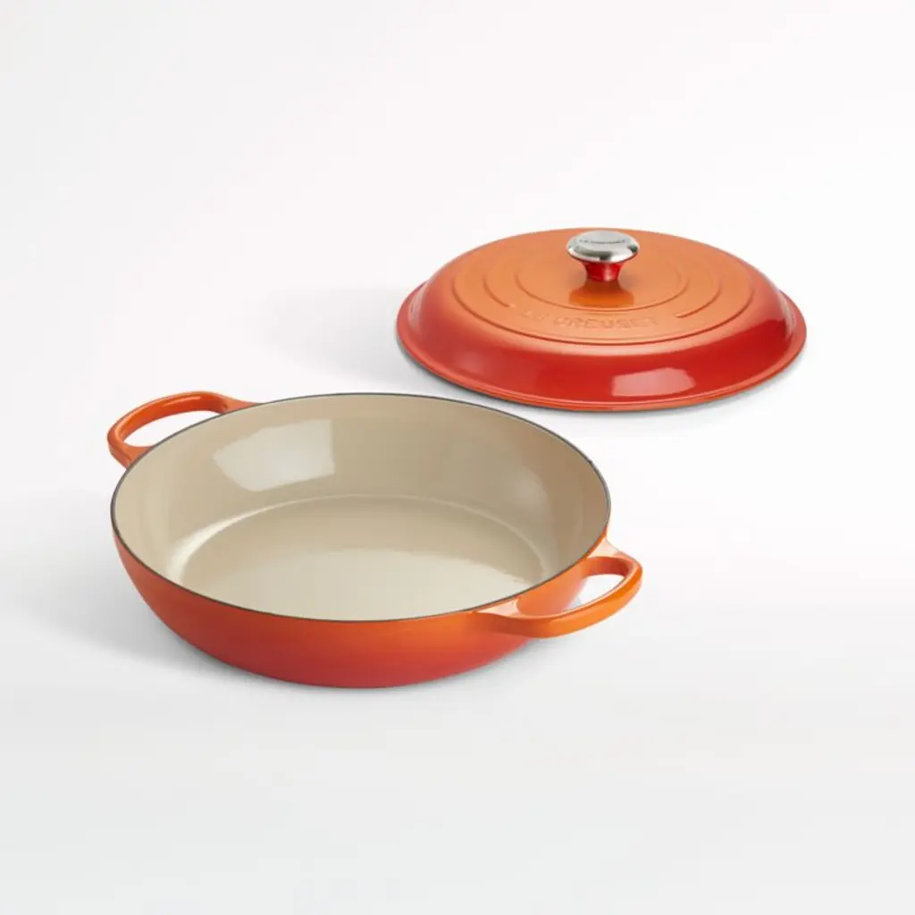 Revered by both professional chefs and home cooks since its 1925 debut, Le Creuset's classic French cookware is prized for its utilitarian good looks and unsurpassed heat retention. In a fiery flame hue, this cast iron pan is clad in smooth enamel, rendering each piece impervious to acid, alkali, odors and stains. Designed with double handles for beautiful balance, the braiser pan lends itself to a variety of cooking methods for a wide range of meals. The close-fitting lid creates a blanket of heat for even cooking, lending itself to braising and keeping foods warm. The rim of each pan has a specially designed "all-round" lip for drip-free pouring with the right or left hand. Non-reactive cooking surface does not require seasoning. This braiser pan is perfect for family-size stews, paella or rice. Compatible with all types of heat sources, from gas and electric stoves, to ceramic and glass cooktops, to induction and halogen, the pan is topped with a stainless steel knob.