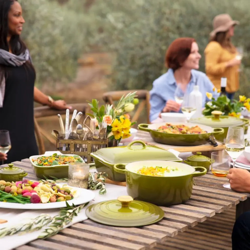 This braiser is clad in sunbathed green enamel inspired by California's olive groves. The durable coating infused with an invigorating hint of yellow renders the cast iron impervious to acid, odors and stains, and the everyday pan requires no seasoning. Topped with a gleaming gold-finished knob, the close-fitting lid creates a blanket of heat for even cooking, ideal for braising and keeping foods warm. This everyday pan goes effortlessly from stove to oven to table for a sprightly spring presentation of paella, olive bread or raspberry crumble.Revered by both professional chefs and home cooks since its 1925 debut, Le Creuset's classic French cookware is prized for its utilitarian beauty and unsurpassed heat retention.