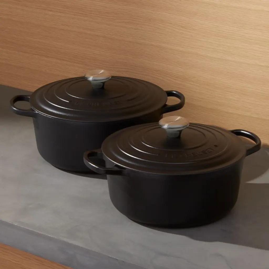 Revered by both professional chefs and home cooks since its 1925 debut, Le Creuset's classic French cookware is prized for its utilitarian good looks and unsurpassed heat retention. In a chic matte black that suits modern kitchens, our cast iron cookware is clad in smooth enamel, rendering each piece impervious to acid, alkali, odors and stains. Non-reactive cooking surface does not require seasoning. Compatible with all types of heat sources, from gas and electric stoves, to ceramic and glass cooktops, to induction and halogen, the Dutch ovens are topped with stainless steel knobs on their lids.