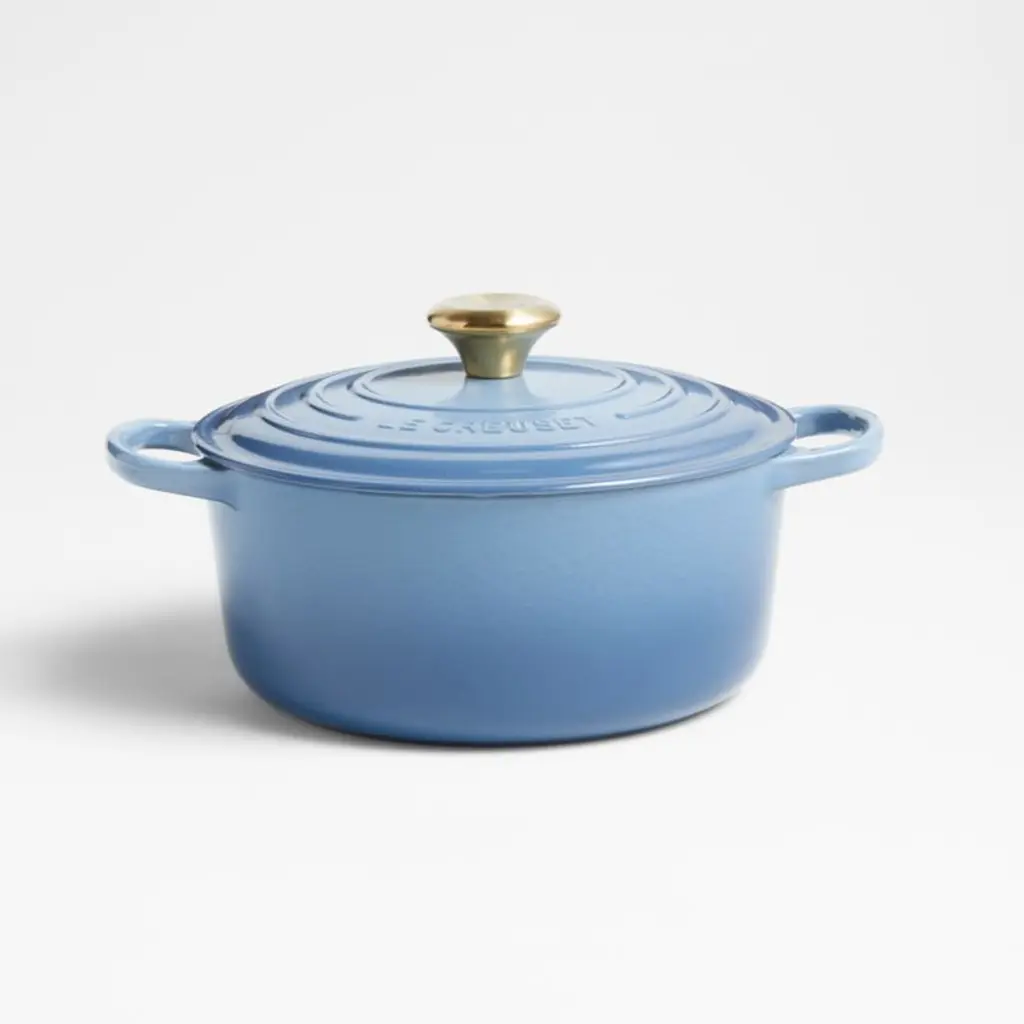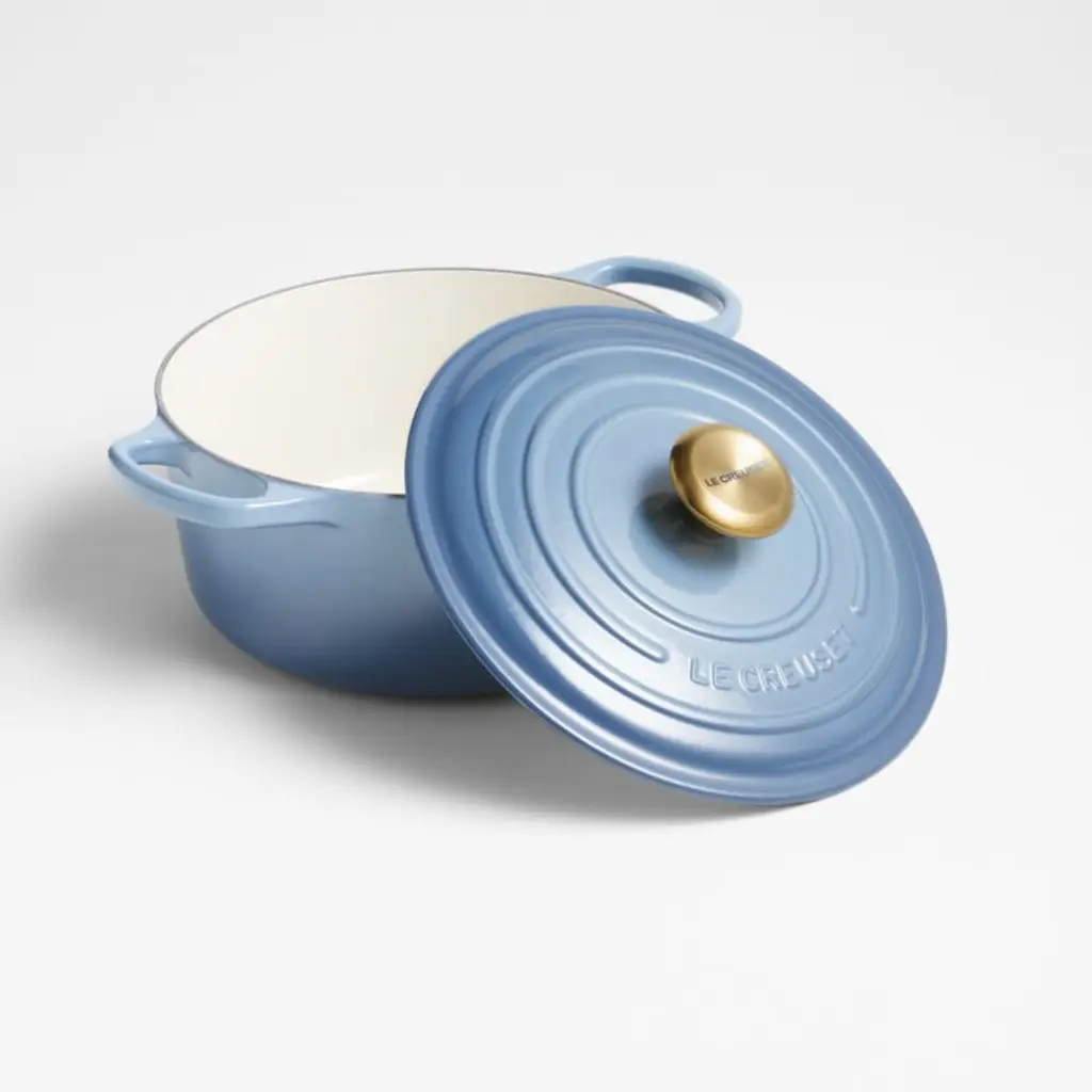 Curated for us exclusively, this gorgeous shade of blue is as casual and chic as your favorite pair of jeans. The creamy blue enamel coating is not only beautiful, it also ensures that the cast iron Dutch oven is impervious to acid, alkali, odors and stains. Indispensable for slow-cooking, braising, searing, roasting or baking, the lidded pot delivers even and consistent heat. The smooth interior promotes caramelization, resists stains and prevents sticking for easy cleanup. Sized to cook up four to five servings, the round Dutch oven is ideal for family dinners. Use it for whatever's on the menu, be it bread, soup, roast chicken or stir-fry.Revered by both professional chefs and home cooks since its 1925 debut, Le Creuset's classic French cookware is prized for its utilitarian beauty and unsurpassed heat retention.