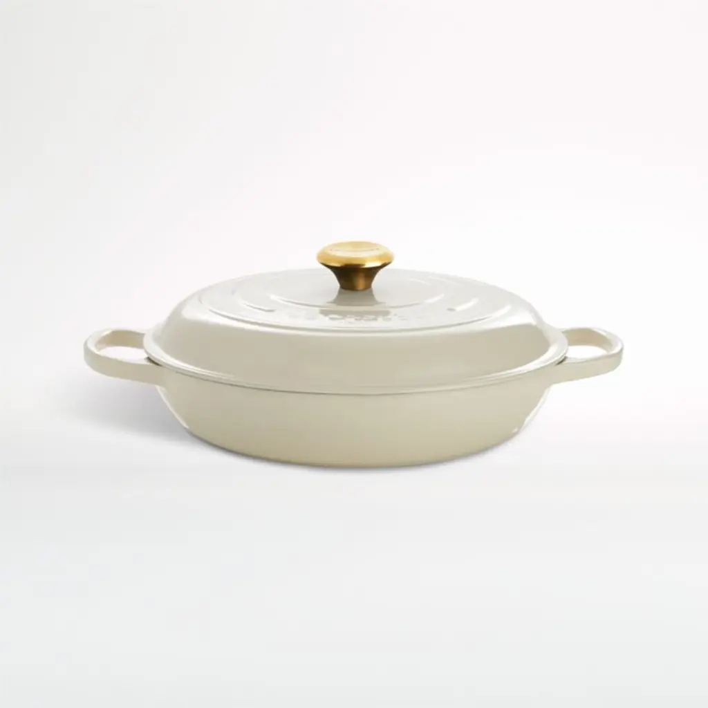 Revered by both professional chefs and home cooks since its 1925 debut, Le Creuset's classic French cookware is prized for its utilitarian good looks and unsurpassed heat retention. In a fresh cream color you'll find only at Crate and Barrel, our cast iron cookware is clad in smooth enamel, rendering each piece impervious to acid, alkali, odors and stains. Topped with a gleaming gold knob, this lidded braiser pan is perfect for family-size stews, paella or rice. Its non-reactive cooking surface does not require seasoning and braises to perfection with wet or dry cooking methods. Compatible with all types of heat sources, from gas and electric stoves, to ceramic and glass cooktops, to induction and halogen.