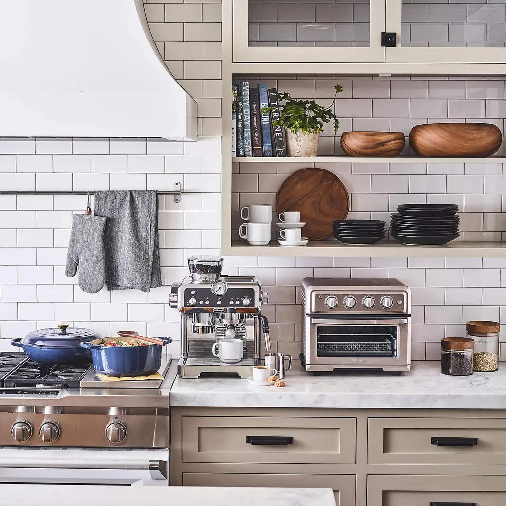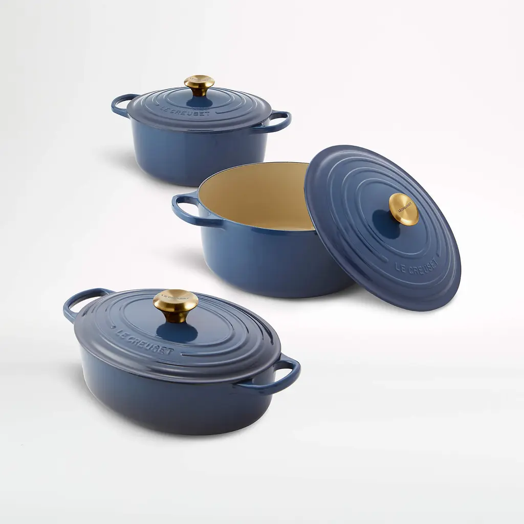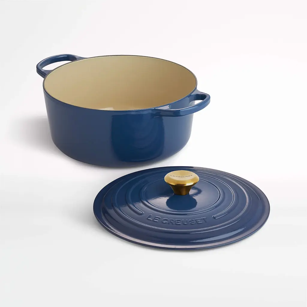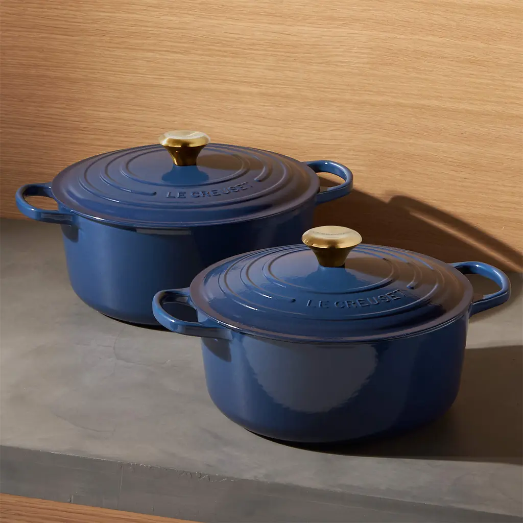 Revered by both professional chefs and home cooks since its 1925 debut, Le Creuset's classic French cookware is prized for its utilitarian good looks and unsurpassed heat retention. In a deep shade of inky blue you'll find only at Crate and Barrel, our cast iron cookware is clad in smooth,, rendering each piece impervious to acid, alkali, odors and stains. Non-reactive cooking surface does not require seasoning. Compatible with all types of heat sources, from gas and electric stoves, to ceramic and glass cooktops, to induction and halogen. Topped with gleaming gold knobs, the lidded Dutch ovens go from stove to oven to table with ease and clean up easily in the dishwasher.