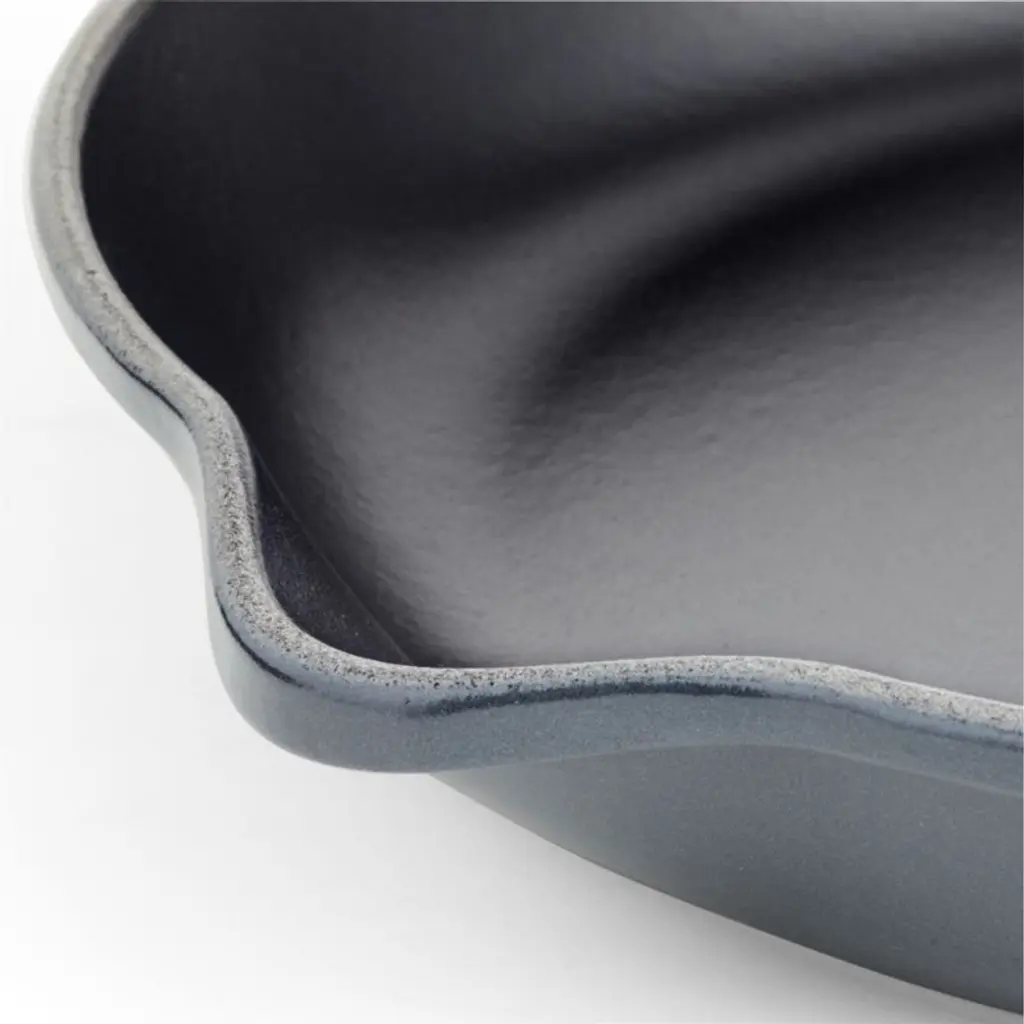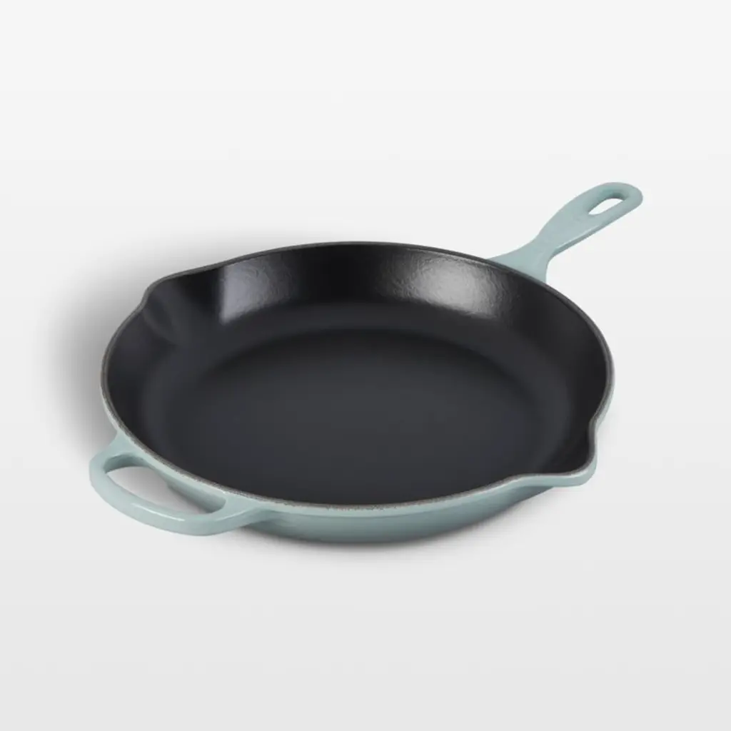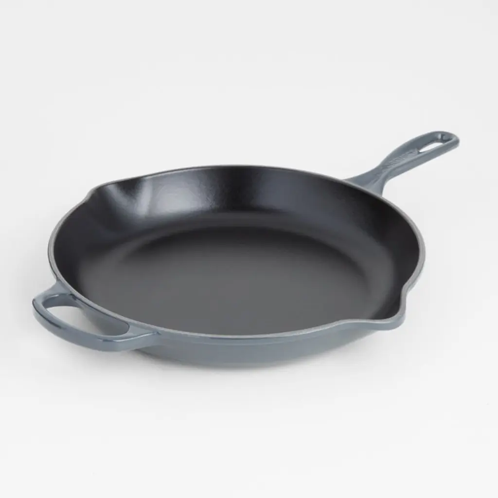 Creamy enamel in a graphite grey shade you'll only find at Crate & Barrel coats this cast iron skillet with a smooth, shock-resistant finish, making it impervious to acid, alkali, odors and stains. The non-reactive cooking surface does not require seasoning, and the pan is compatible with all types of heat sources, from gas and electric stoves to ceramic, glass, induction and halogen stovetops. Use this skillet to saute mushrooms, cook pancakes and fry bacon.View all Le Creuset products Le Creuset® and other Wedding Registry offers