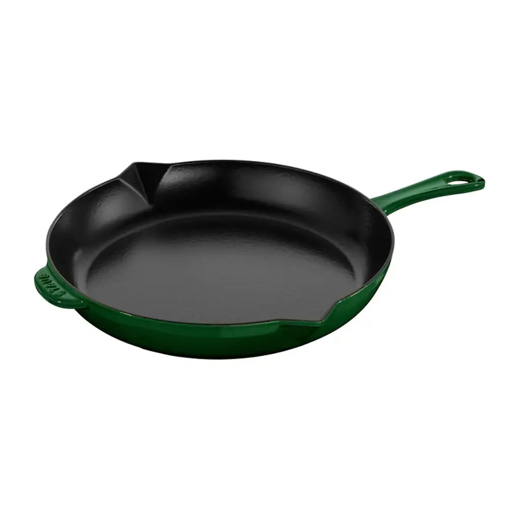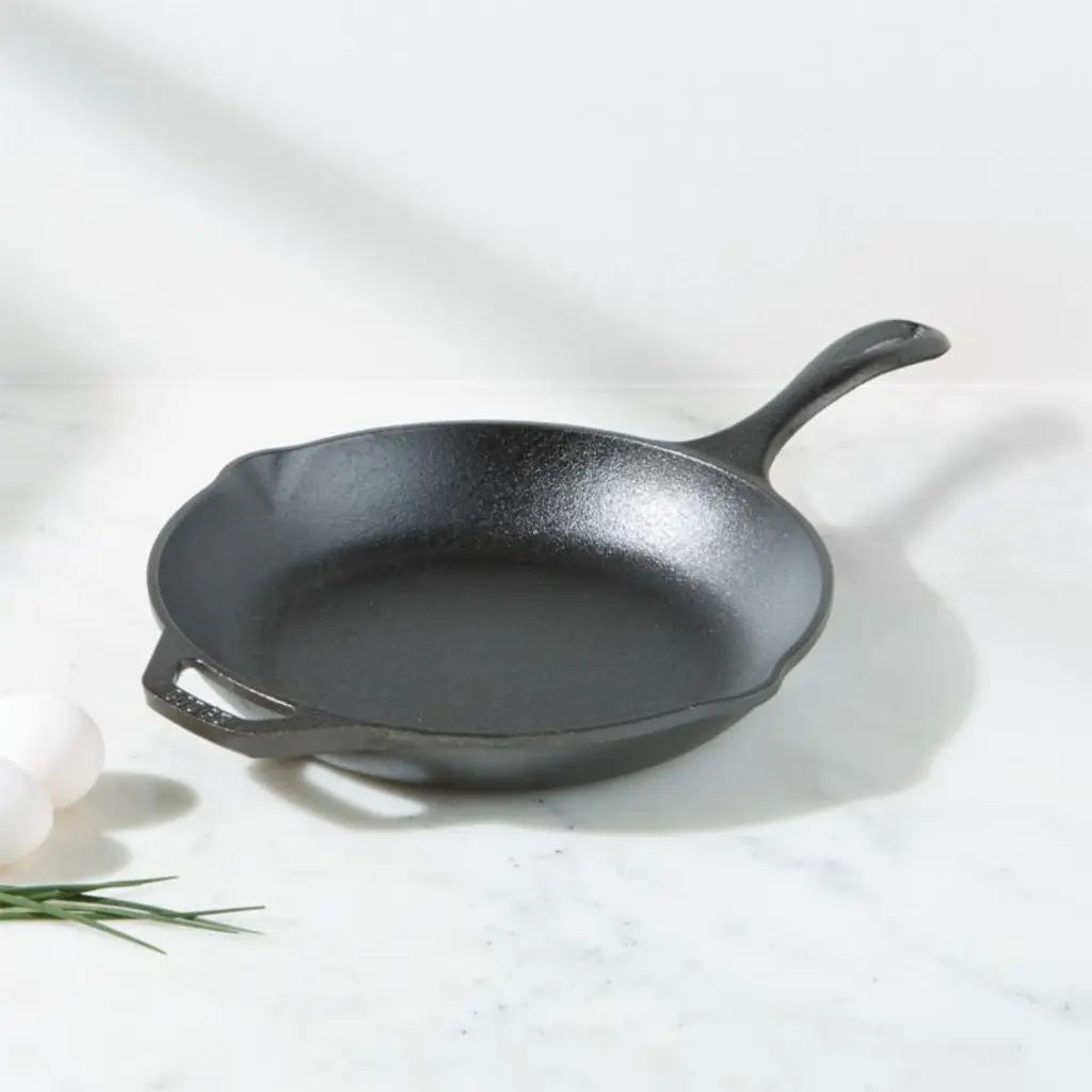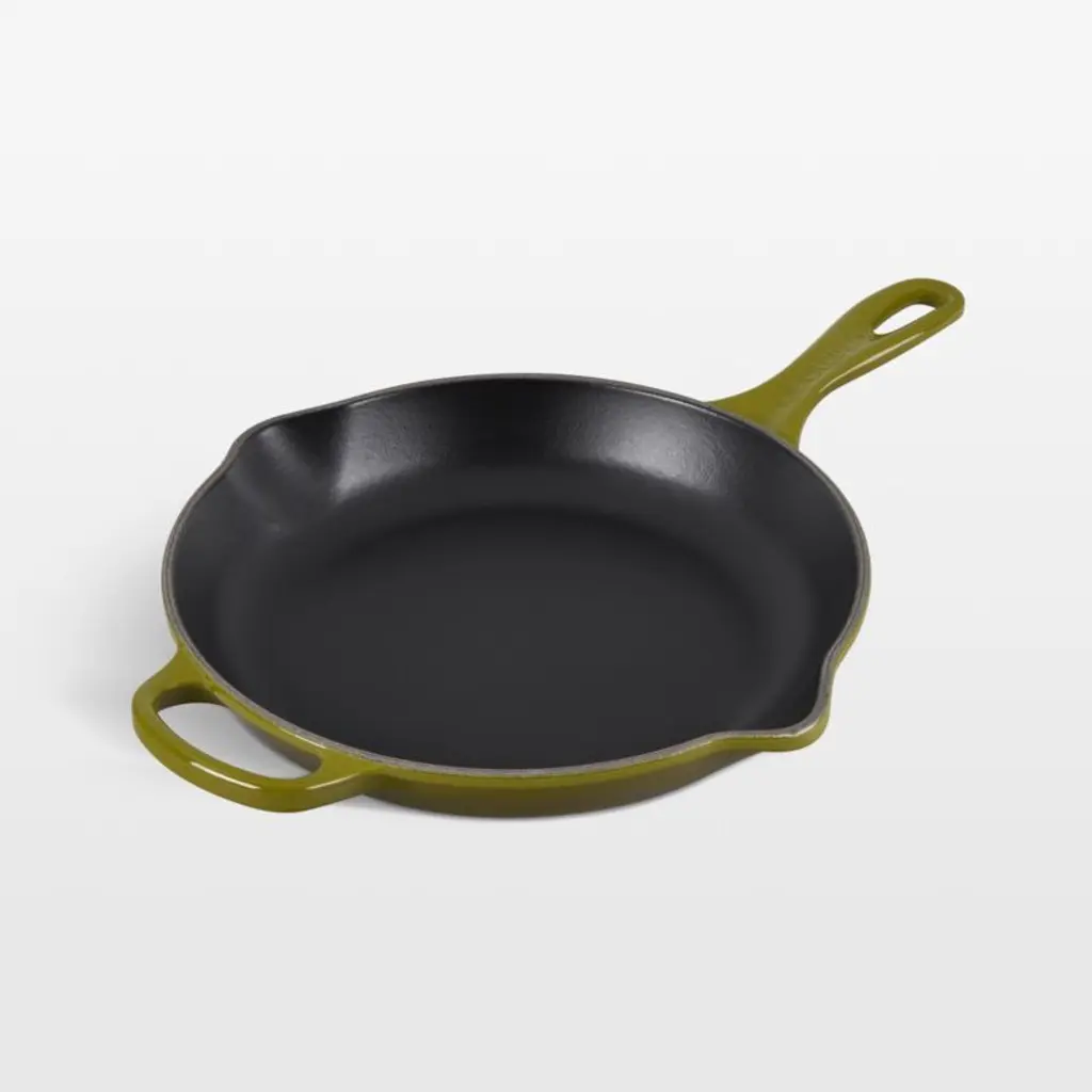 Creamy enamel in a graphite grey shade you'll only find at Crate & Barrel coats this cast iron skillet with a smooth, shock-resistant finish, making it impervious to acid, alkali, odors and stains. The non-reactive cooking surface does not require seasoning, and the pan is compatible with all types of heat sources, from gas and electric stoves to ceramic, glass, induction and halogen stovetops. Use this skillet to saute mushrooms, cook pancakes and fry bacon.View all Le Creuset products Le Creuset® and other Wedding Registry offers