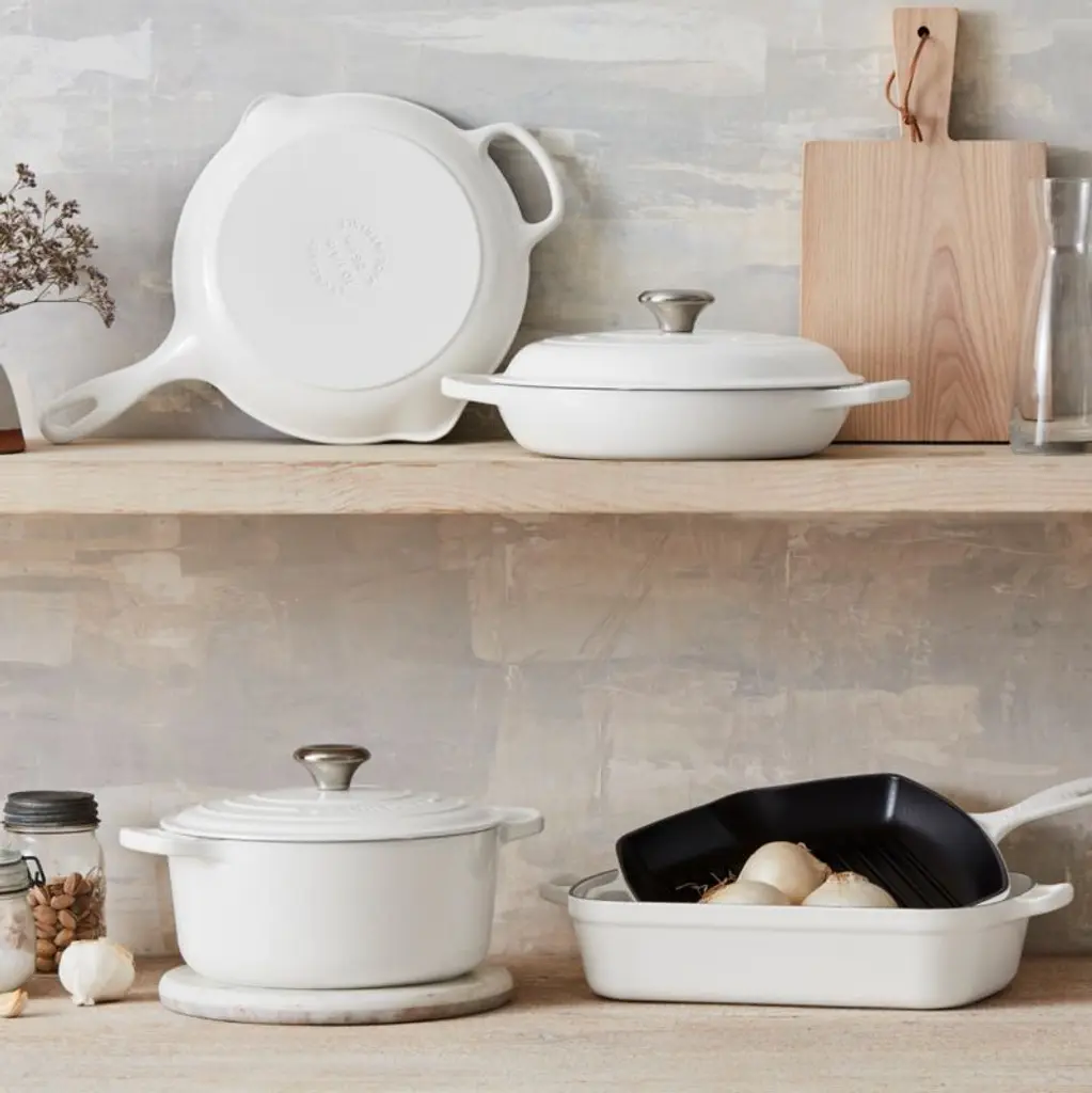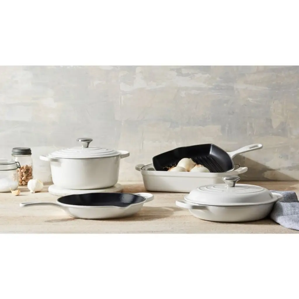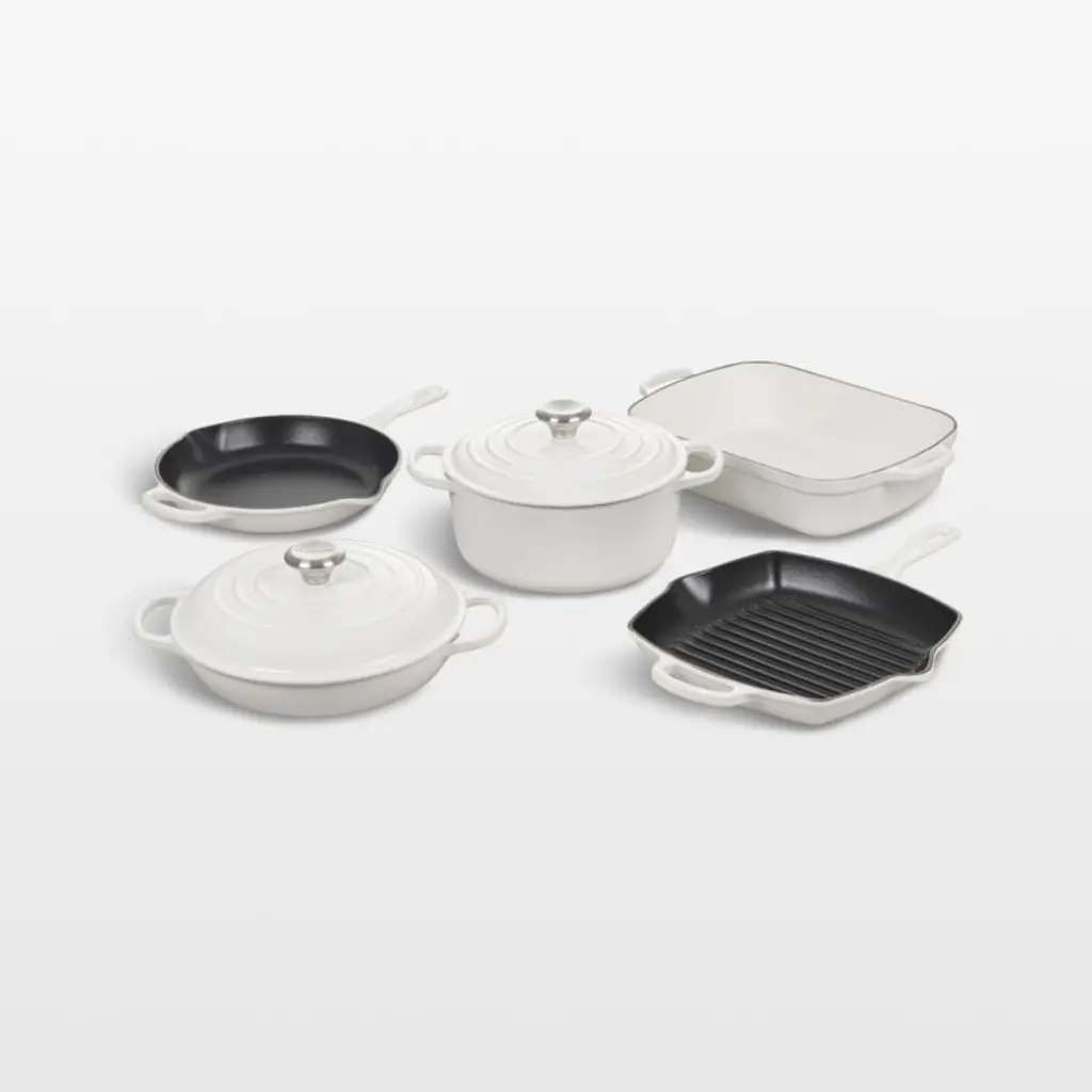 Featuring timeless favorites from Le Creuset, this seven-piece cookware collection makes a fabulous wedding, anniversary or housewarming gift. The durable cast iron clad in glossy white enamel is designed to last a lifetime. The roasting pan, Dutch oven and braiser have Le Creuset's signature sand-hued interior, while the skillet and grill pan feature a black enamel finish suitable for higher temperatures. All piecesincluding the lids adorned with sturdy stainless steel knobssafely go from the stovetop to the oven to the table to serve with style.Revered by both professional chefs and home cooks since its 1925 debut, Le Creuset's classic French cookware is prized for its utilitarian beauty and unsurpassed heat retention.