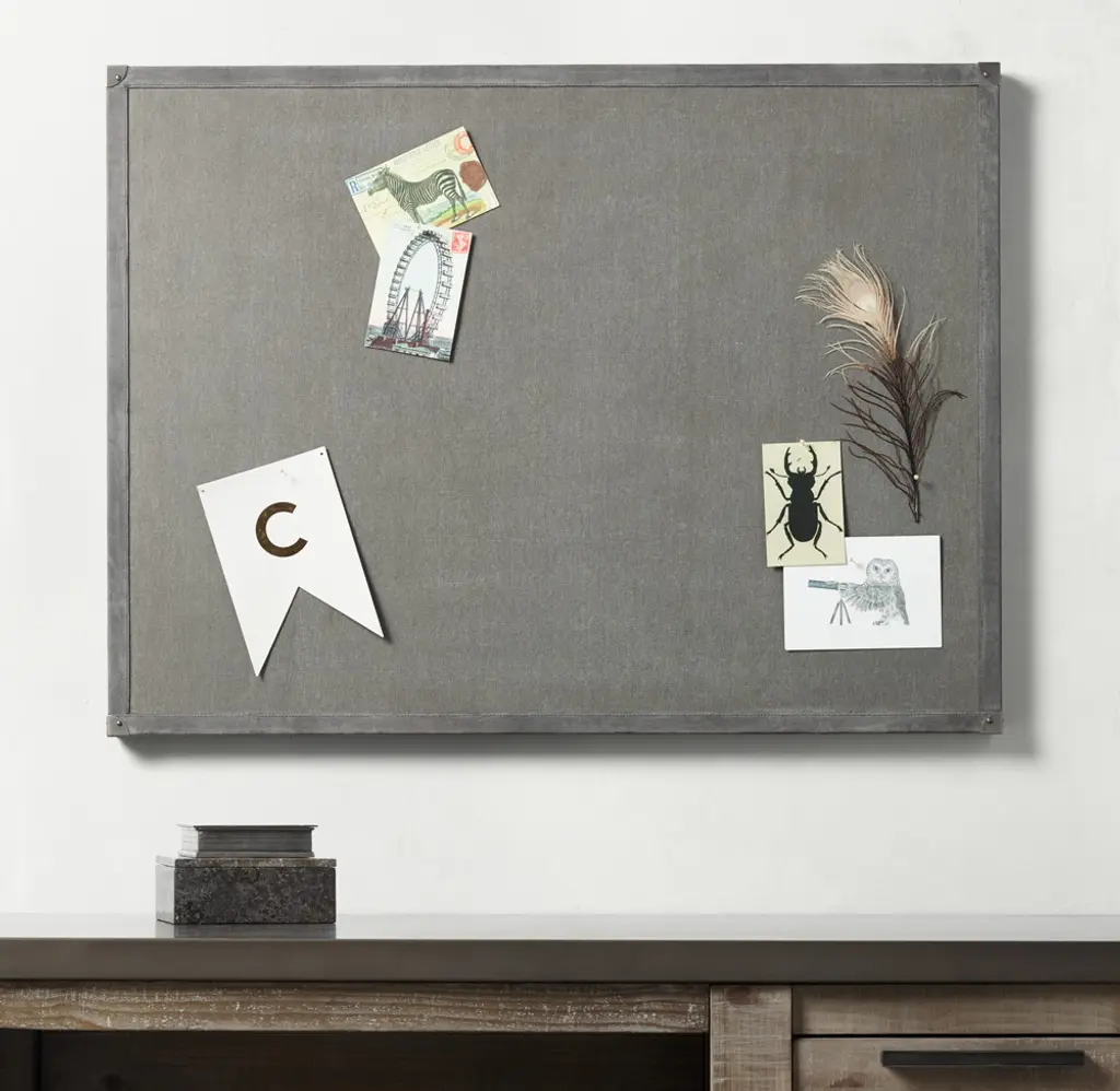 A tale of two textures. Framed in distressed leather with riveted metal corner brackets, our canvas-covered memory board provides a rustic surround for the souvenirs of life.