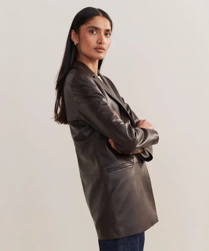 Leather Brooke Blazer Chocolate Meet the new essential you’ll add to your wardrobe today and style for years to come. With an elongated silhouette, this piece is great for layering and it’s primed for all types of styling needs. Wear it as a jacket over a sweater, t-shirt, or blouse—and pair it with jeans, a skirt, or trousers through the seasons. 100% lamb leather. Lining: 100% viscose. Made in Turkey. Two-button, single-breasted blazer.