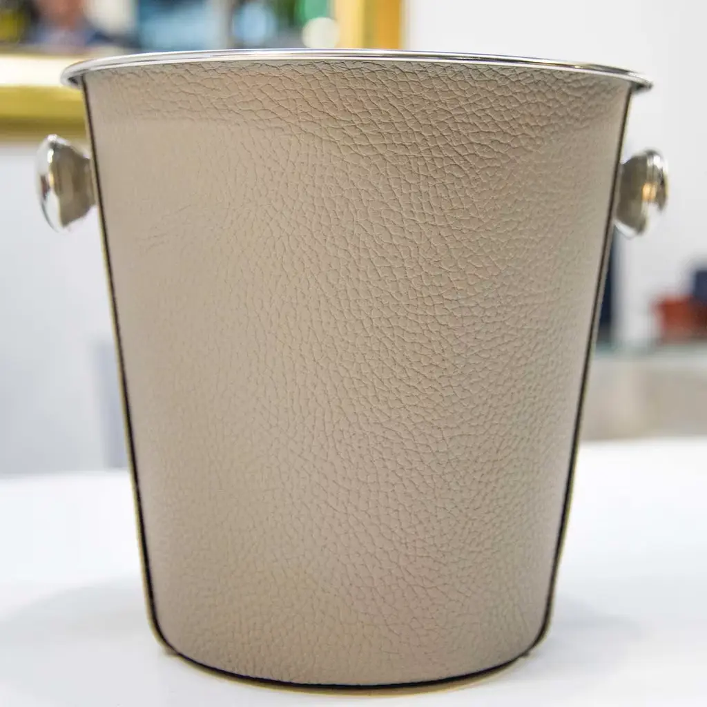 This refined glacette will keep champagne at the perfect temperature and add a vibrant, stylish accent to a formal table setting on special occasions. Handcrafted of stainless steel, its conical shape is wrapped in full grain leather in a neutral sand color whose soft and pebbled texture will suit any interior decor. A must-have accessory in any bar cabinet, this glacette features two round handles in stainless steel with a polished finish. Available in 13 different colors, this is a well-received wedding and housewarming gift for a sophisticated friend.