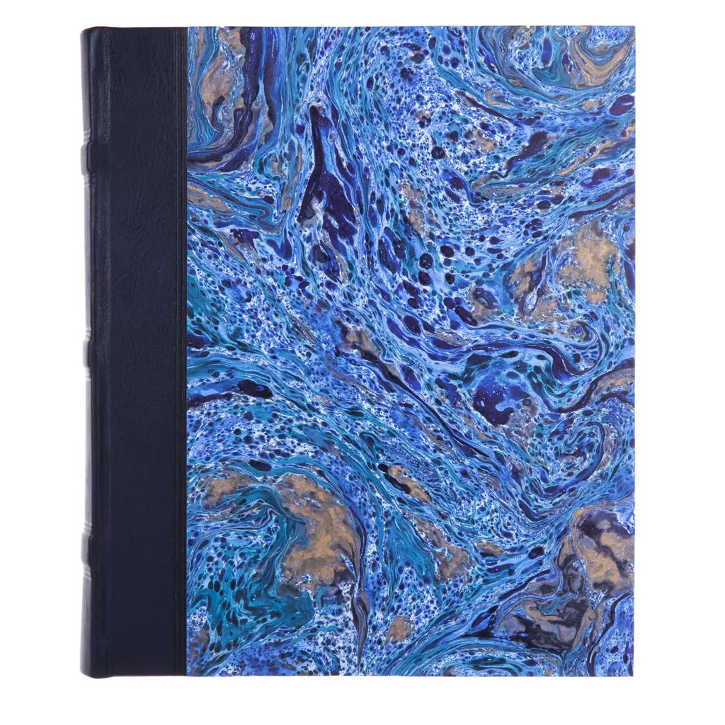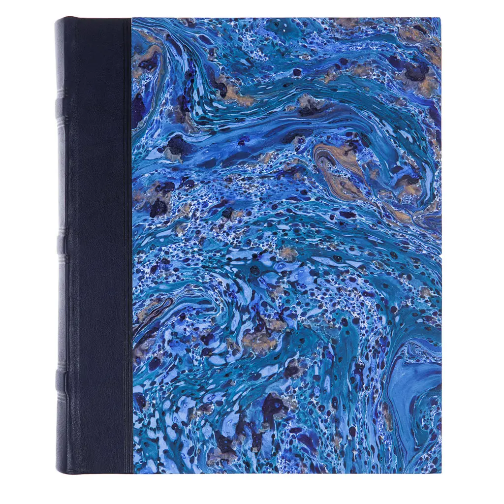 Photo album by Florentine bookbinder Giannini with a leather spine in blue and gorgeous marbled paper cover. It contains 30 ivory card sheets to fix photos and is entirely hand executed with ancient bookbinding techniques to achieve impeccable aesthetic and functionality.