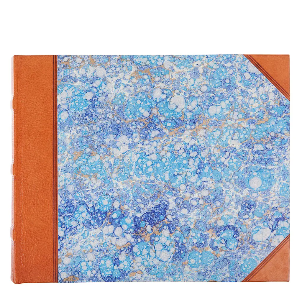 Large photo album by Florentine bookbinder Giannini with naturally tanned leather spine and corners, and a gorgeous blue marbled paper cover. It contains 50 ivory card sheets and is entirely handmade with ancient bookbinding techniques to achieve impeccable aesthetic and functionality.