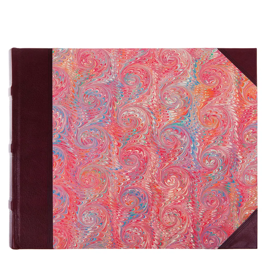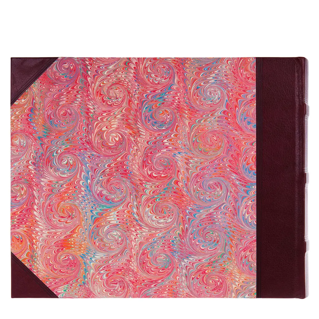 Large photo album by Florentine bookbinder Giannini with leather spine and corners in bordeaux, and a gorgeous marbled paper cover. It contains 50 ivory card sheets and is entirely hand executed with ancient bookbinding techniques to achieve impeccable aesthetic and functionality.