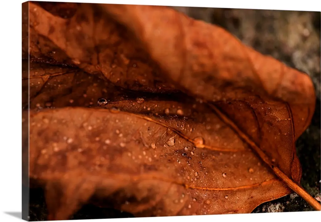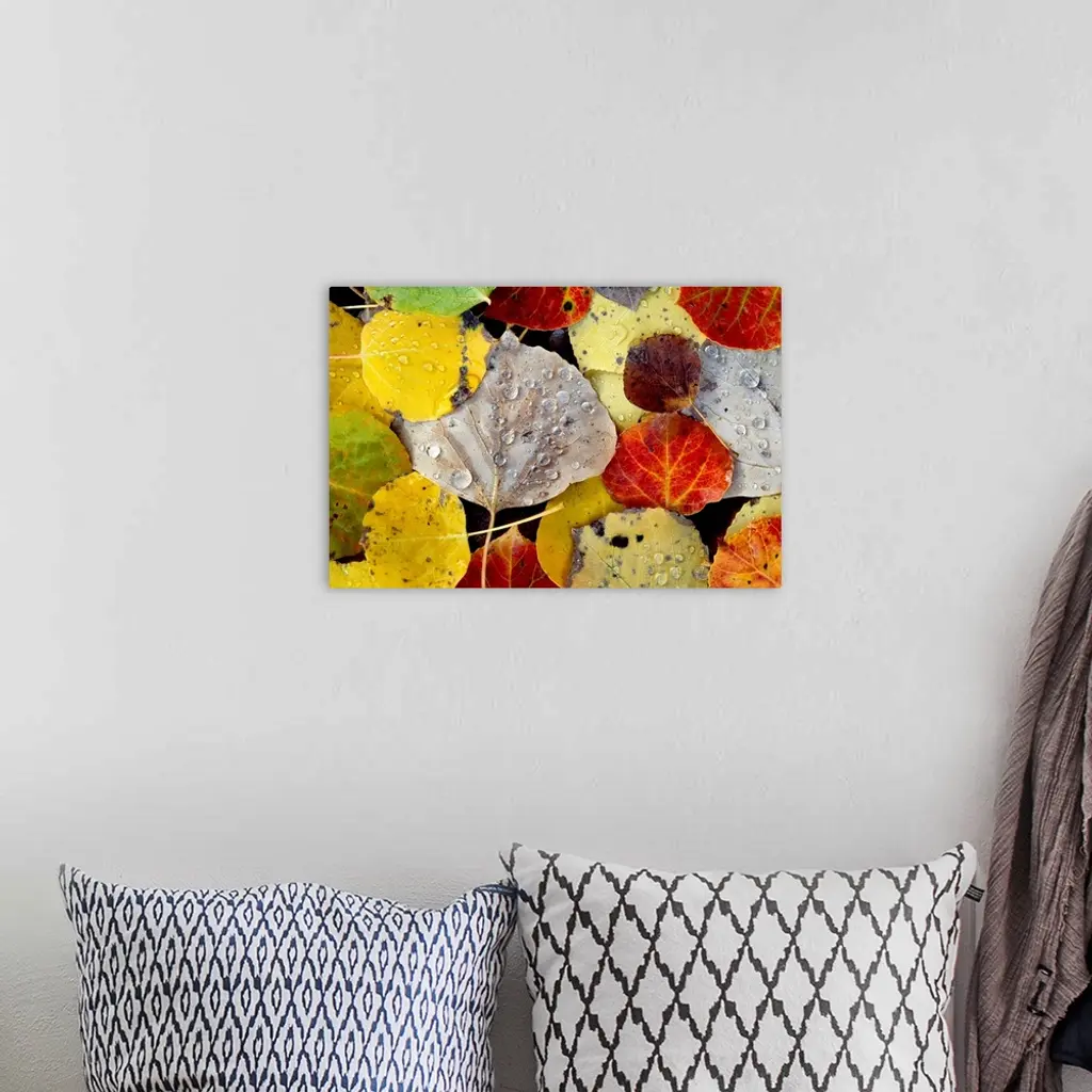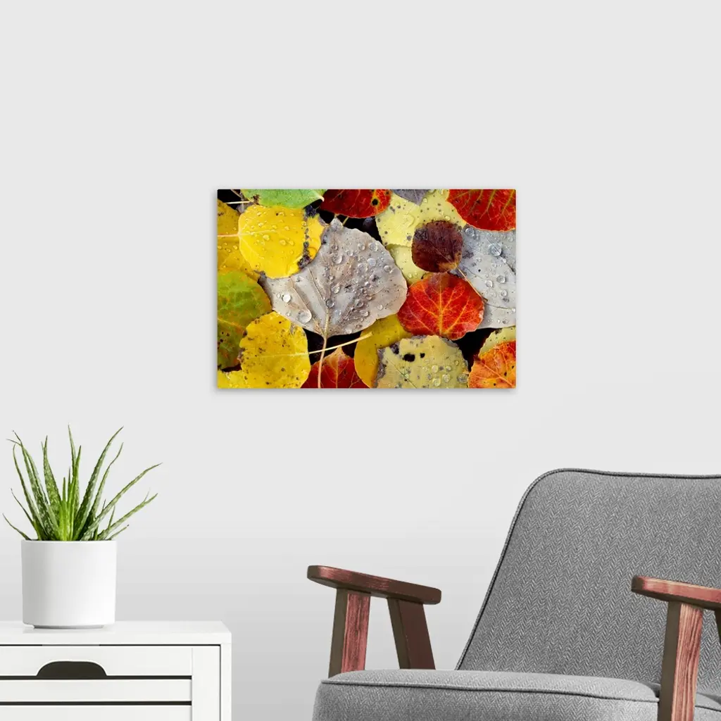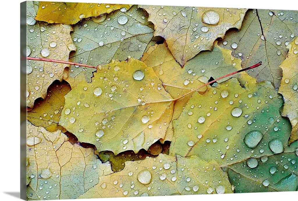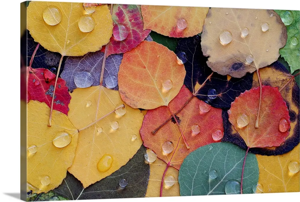 Photograph of leaf collage in fall colors. The veins in the leaves are visible and they have water drops on top of them.