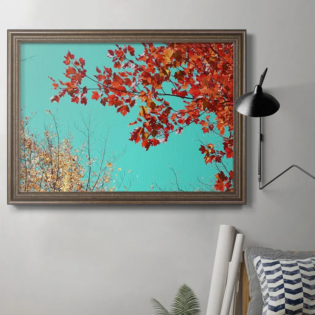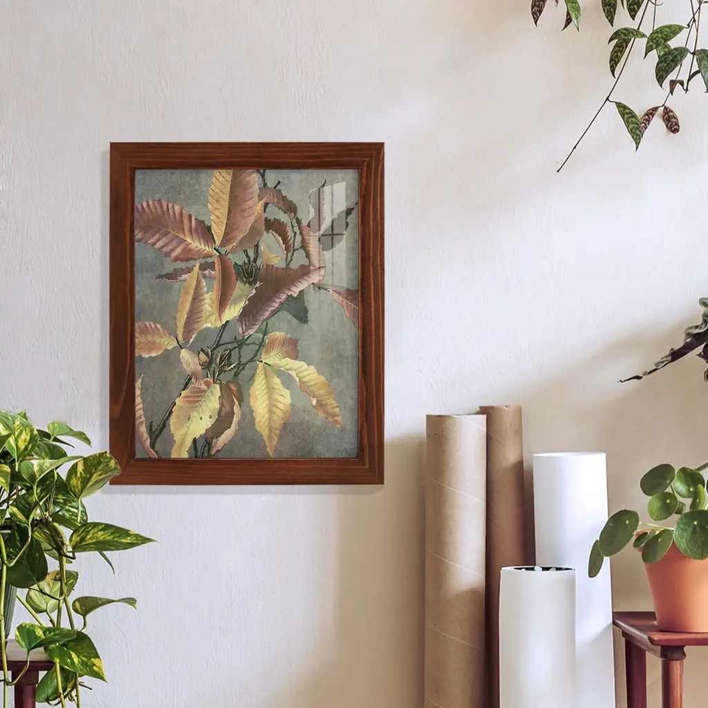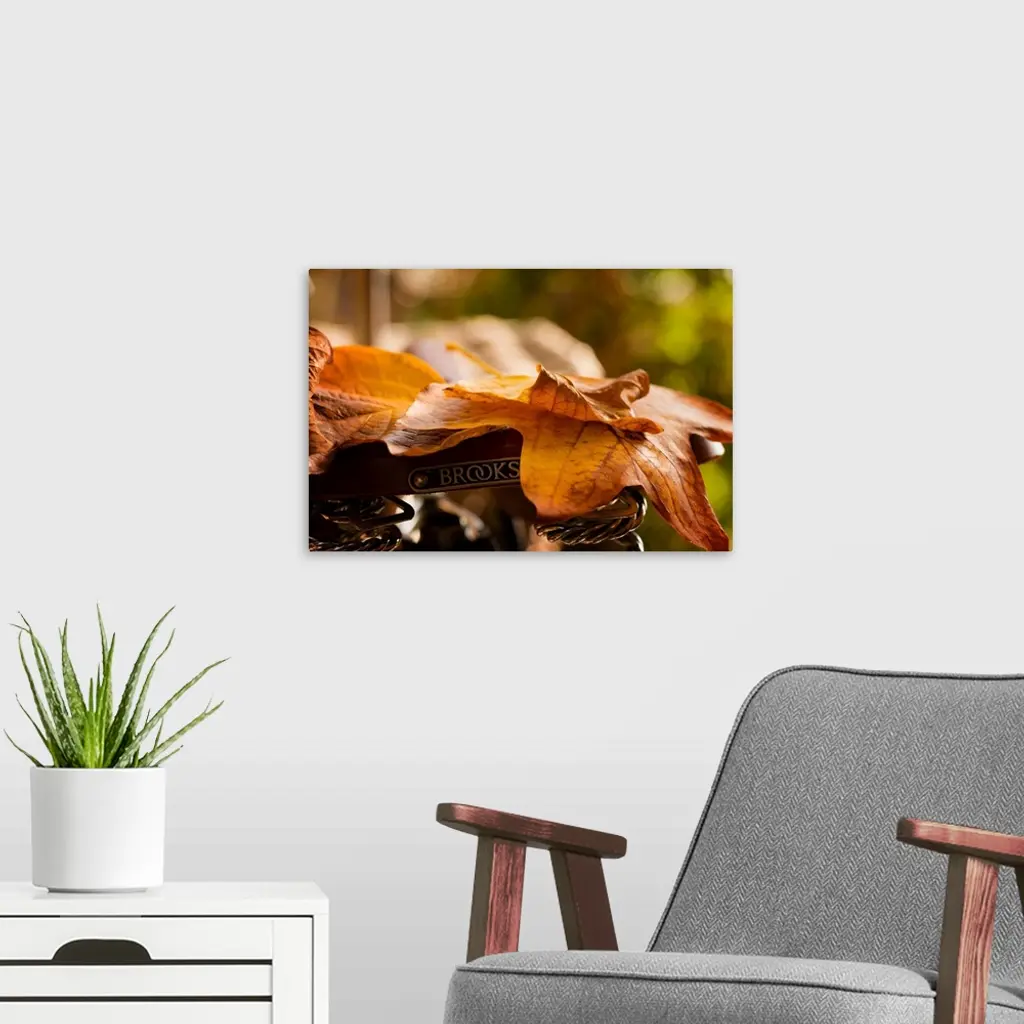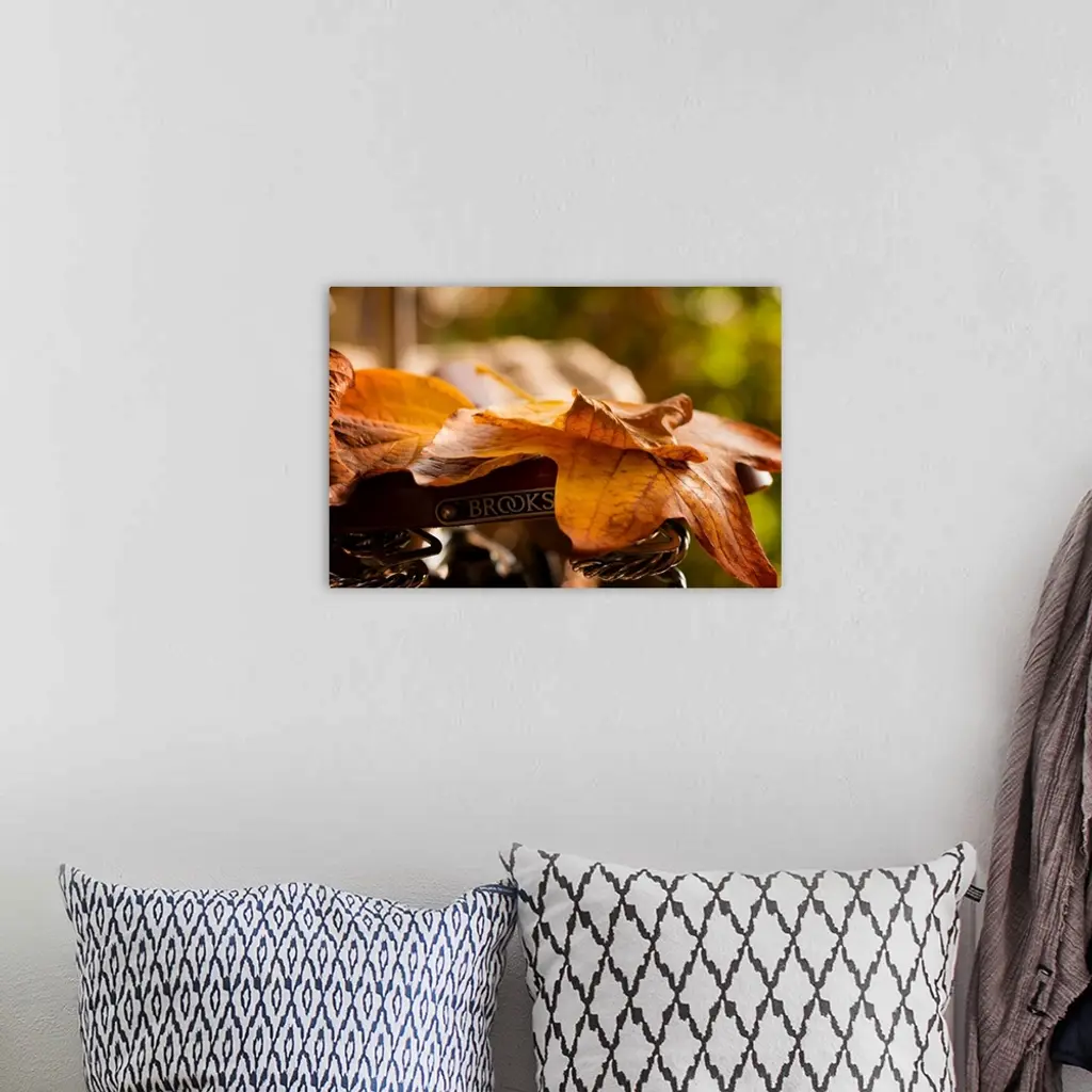 Fine art photo of fallen autumn leaves lying on a bicycle seat.
