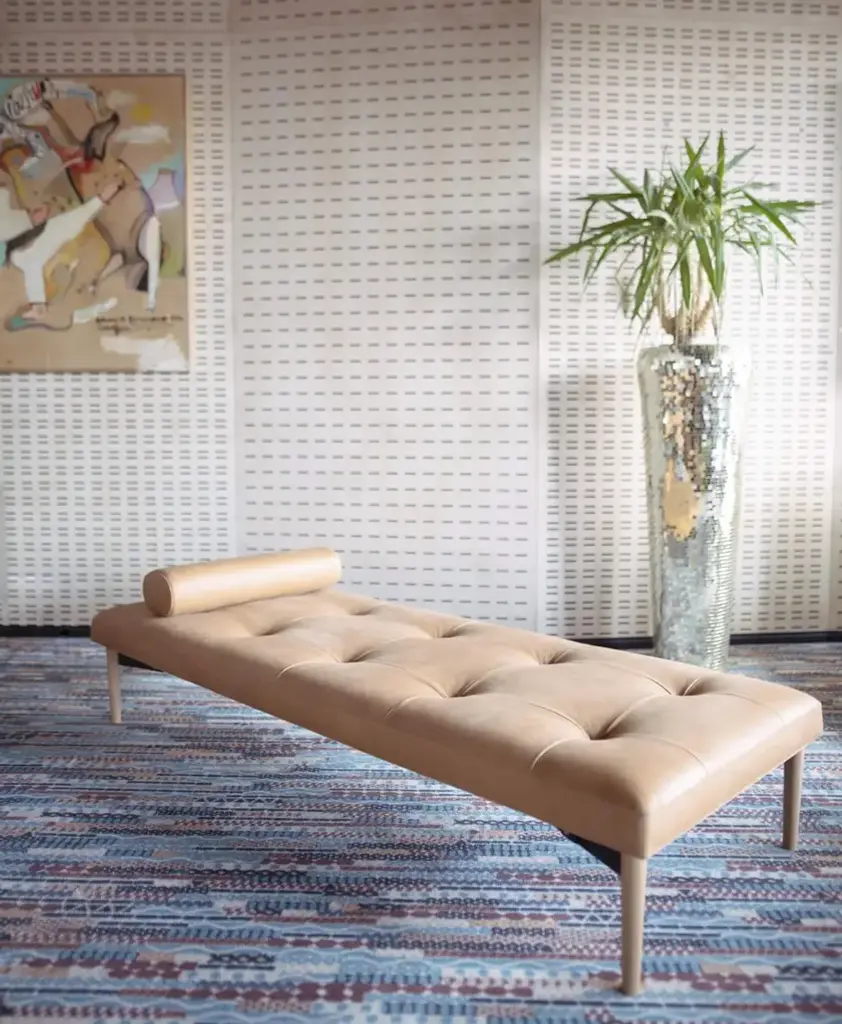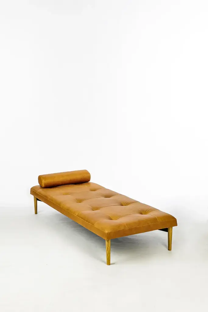 Daybed LEBO provides a brief relief from the everyday hustle. Specially made for those who steal the moment and take a nap, meditate or practice the sleeping yoga.LEBO daybed is a multifunctional piece of furniture – a place to contemplate work matters or a sleeping couch for an overnight guest.Made of natural Vintage leather – stylish but classic furniture leather with a worn look. Oak legs.