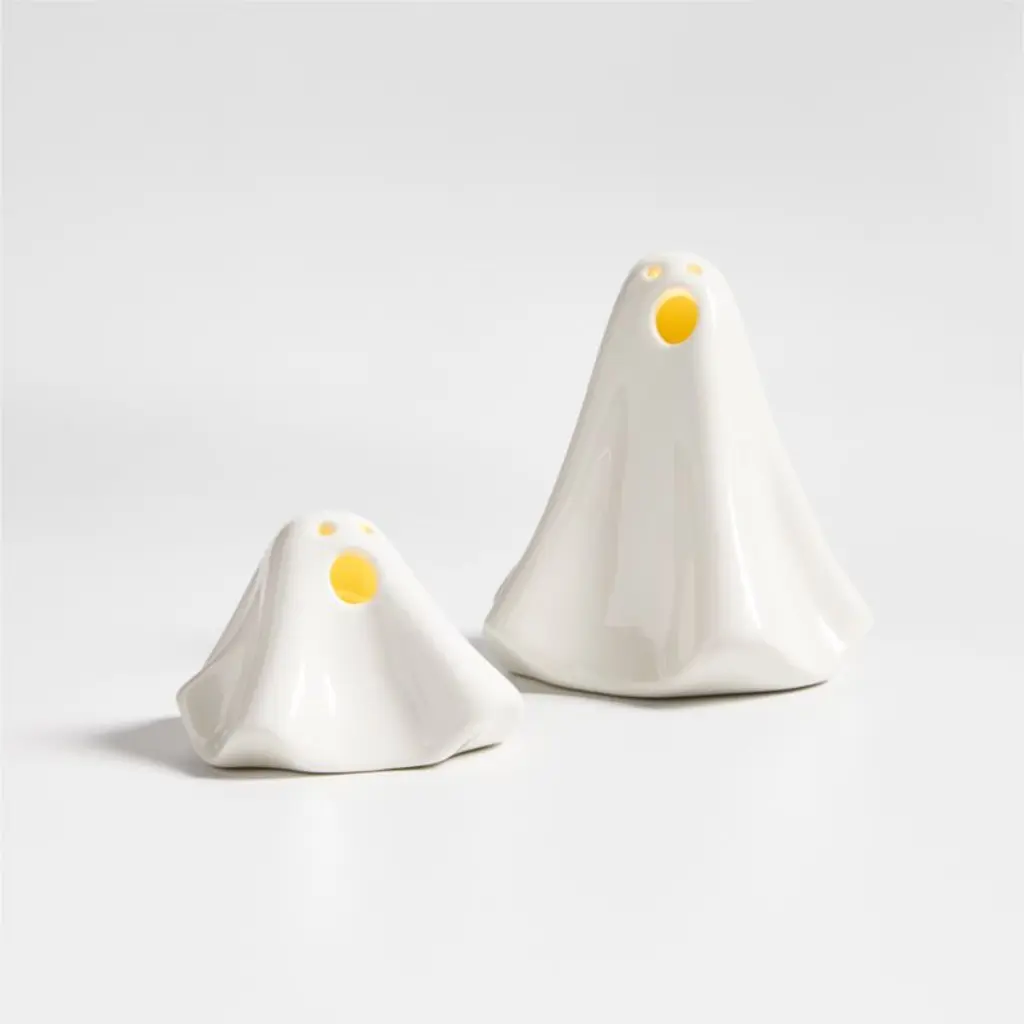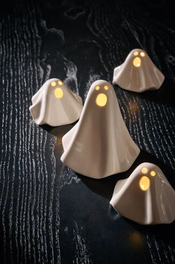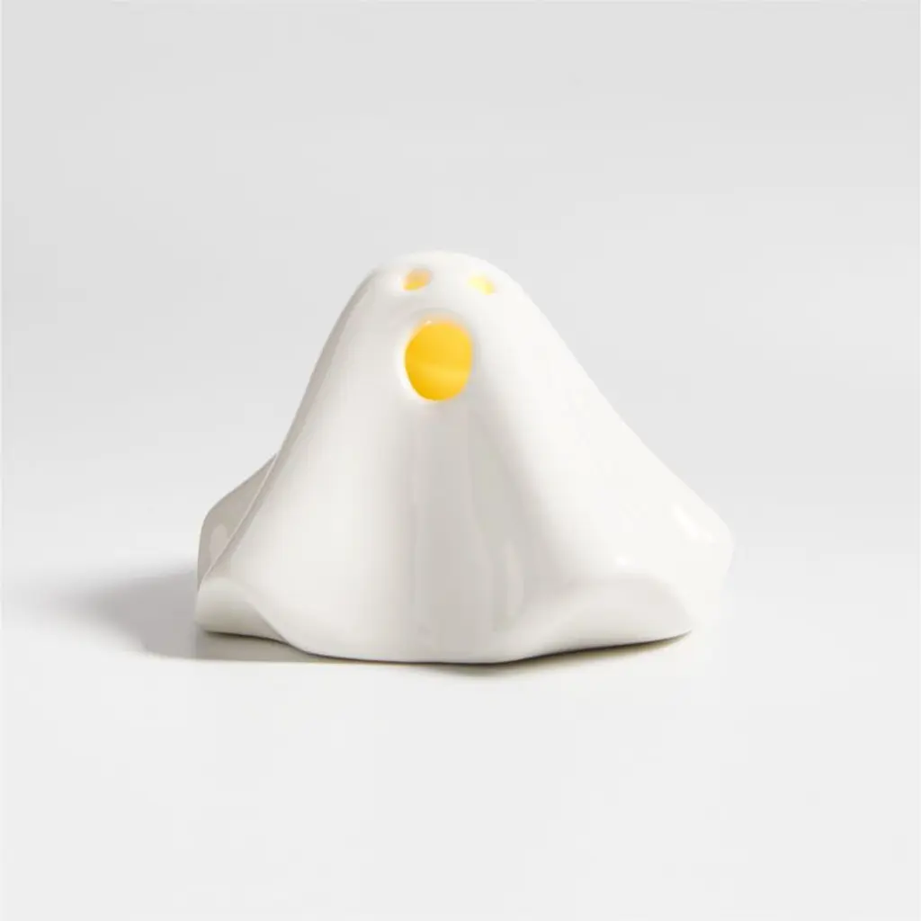 Our delightful ceramic ghost lights up the night against Halloween scareswhile adding its own bit of spookiness to the season. Glazed glossy white, the stoneware form captures the flowing form and haunted facial expression of a classic ghost. LED lights cast a soft glow through the phantasmic eyes and mouths of the petite specter. Our exclusive LED ceramic ghost adds frights and delights to your Halloween decor with a modern, minimalist look in a monochromatic palette.