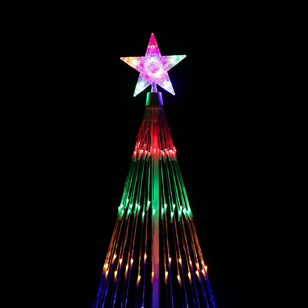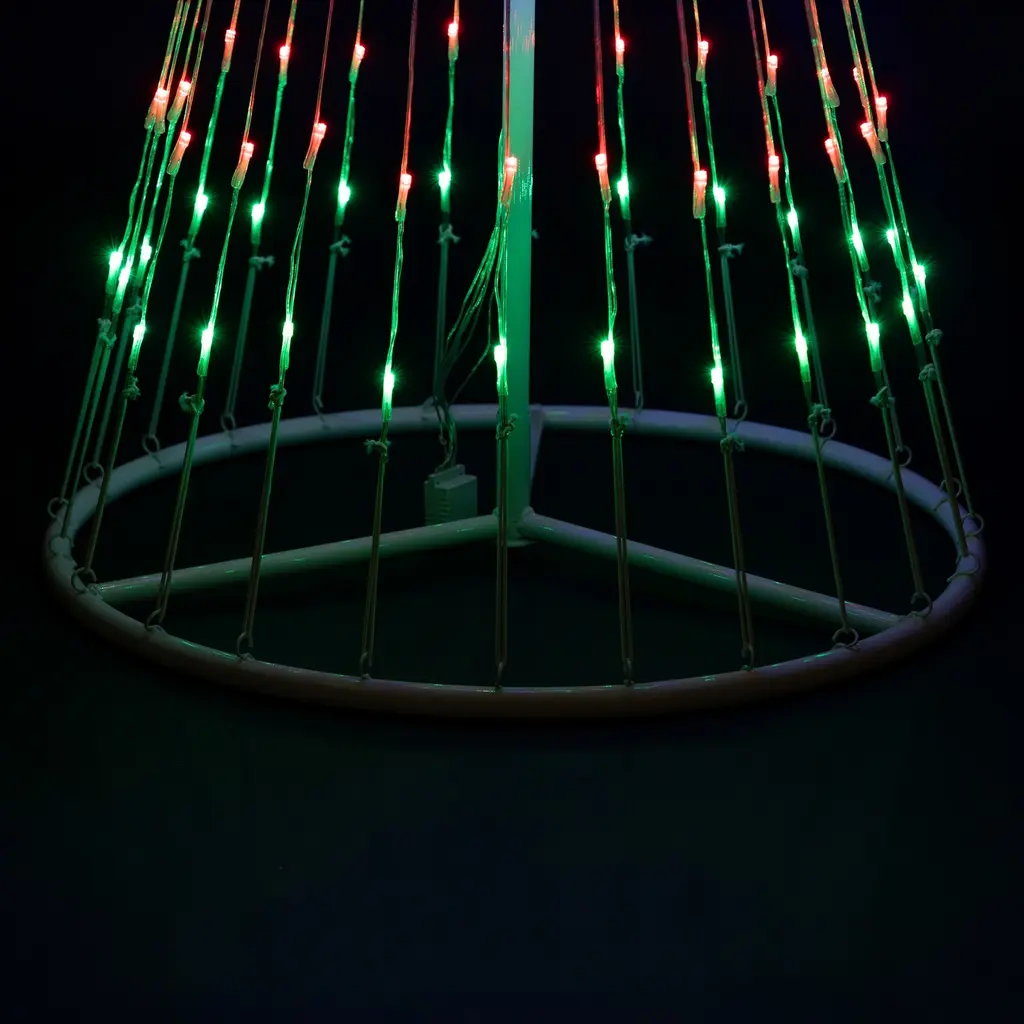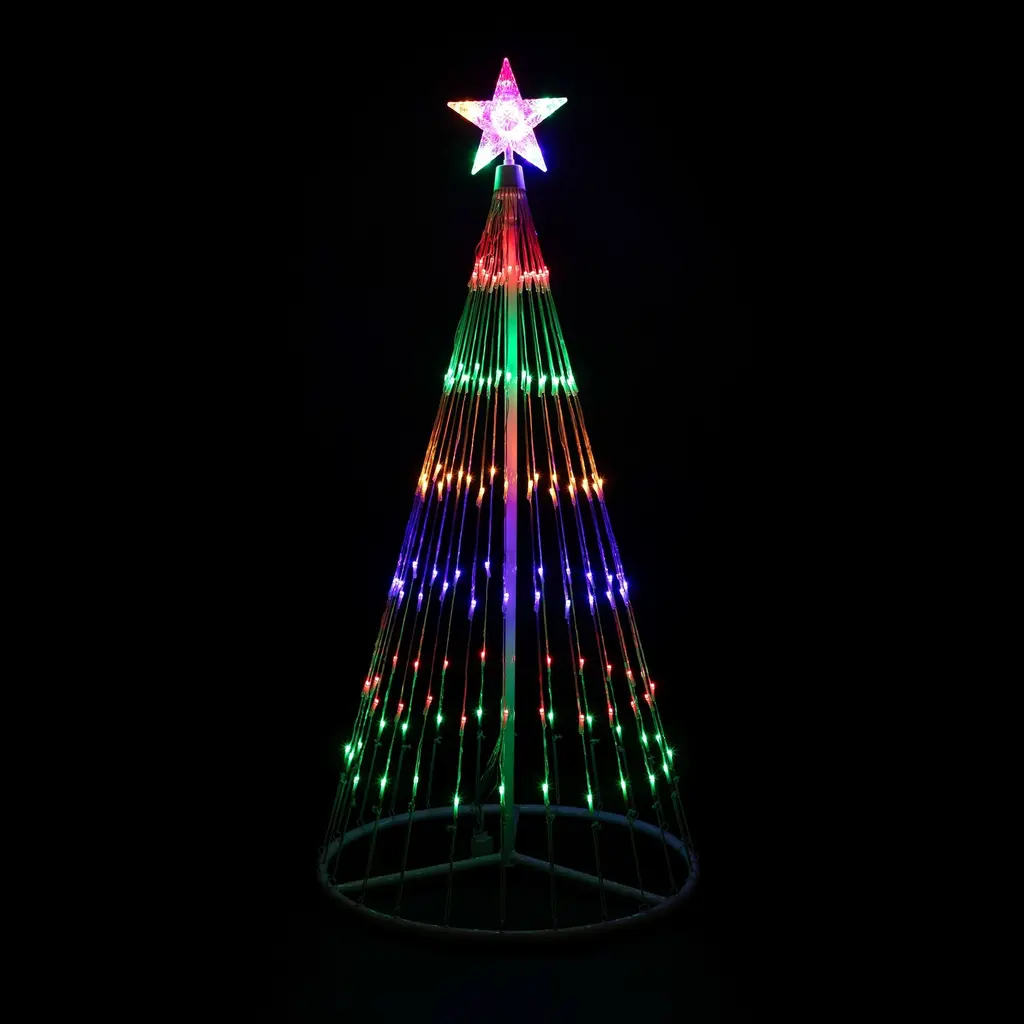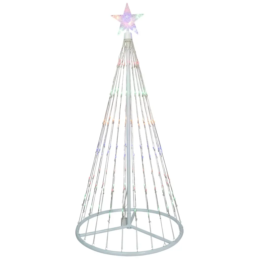More than 150 red, green, gold and blue mini LED lights turn this 4-foot Christmas cone tree into a stunning spectacle for your front yard. Cone trees are easy to assemble and come with a control unit to choose one of 12 lighting effects, from steady to flashing sequences. Topped with a glowing multicolor star, this outdoor lighted Christmas tree is sure to be a highlight of your front yard light show. Product Features: Pre-lit with 150 multi-color lights Multi-color consists of red, green, blue and orange Bulb size: micro Bulb type: LED 9.5' clear lead cord Additional Product Features: LED lights use 90% less energy Cool to the touch Cycles 12 different dazzling light show effects ranging from slow fade, random twinkle, fast spiral just to name a few Assembly required White metal frame and stand Ground stakes included UL listed for indoor or outdoor use Class 2 power supply Input: 120 volts, 60 hertz, .19 amps, 22.8 watts Output: 12 volts, .75 amps, 9 watts Dimensions: 4' high x 24" base diameter (at widest point) Material(s): metal/wire/plastic