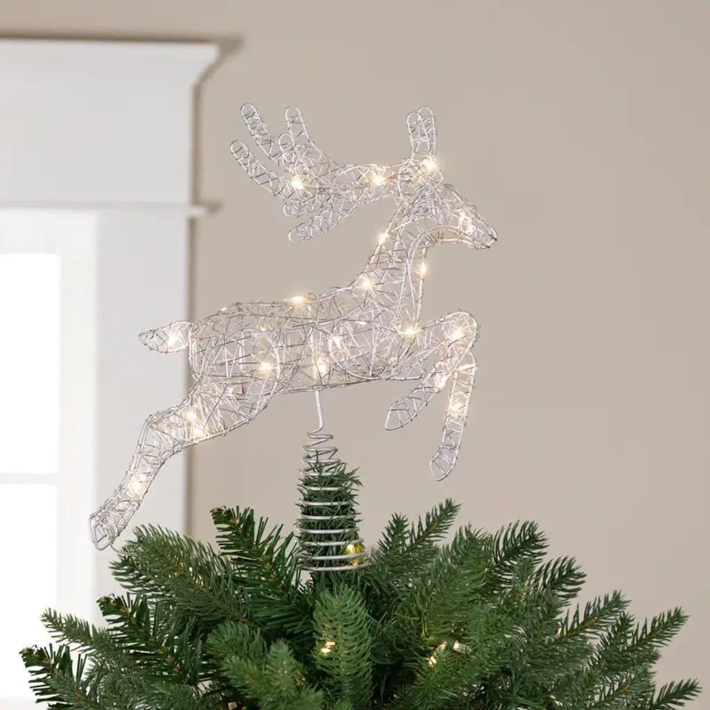 Add a touch of whimsy and holiday cheer to your Christmas tree with our pre-lit reindeer tree topper. This eye-catching topper features a classic reindeer silhouette adorned with warm white LED lights creating a soft glowing effect. This adds a touch of charm making this topper a perfect way to complete your holiday décor.
