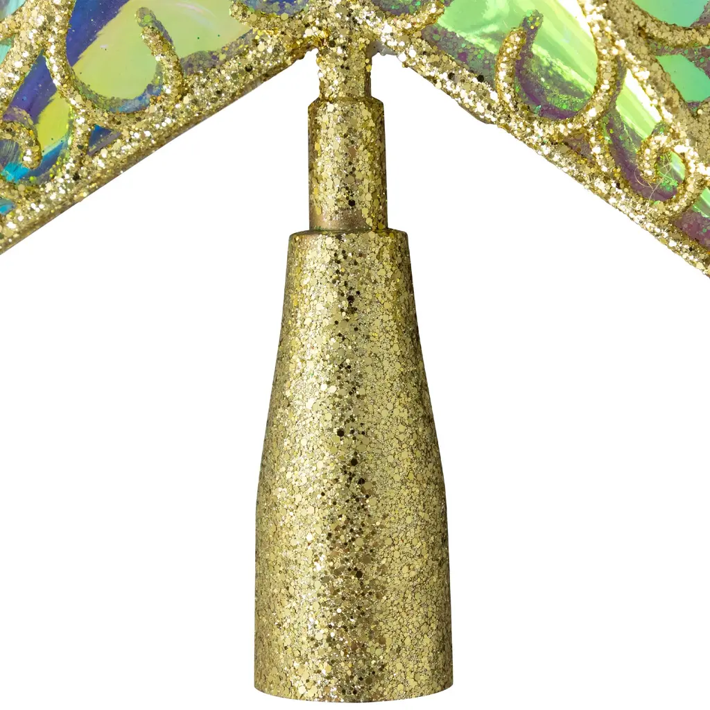 Add a dazzling touch to your holiday decor with our lighted star Christmas tree topper. This iridescent star adorned with a champagne gold glitter swirl design radiates holiday cheer. Featuring multicolor LED lights it offers a vibrant display that shines brilliantly atop your tree. Perfect for creating a magical and joyful atmosphere this tree topper is an eye-catching addition to your seasonal celebrations. Product Features: 3D 5-point star Christmas tree topper Lighted with 10 LED multicolor lights Iridescent star with glittered design Double-sided design Circular cone base Requires 2 "AA" batteries; not included For indoor use only Dimensions: 11"H x 9"W x 3"D Material(s): plastic/wire