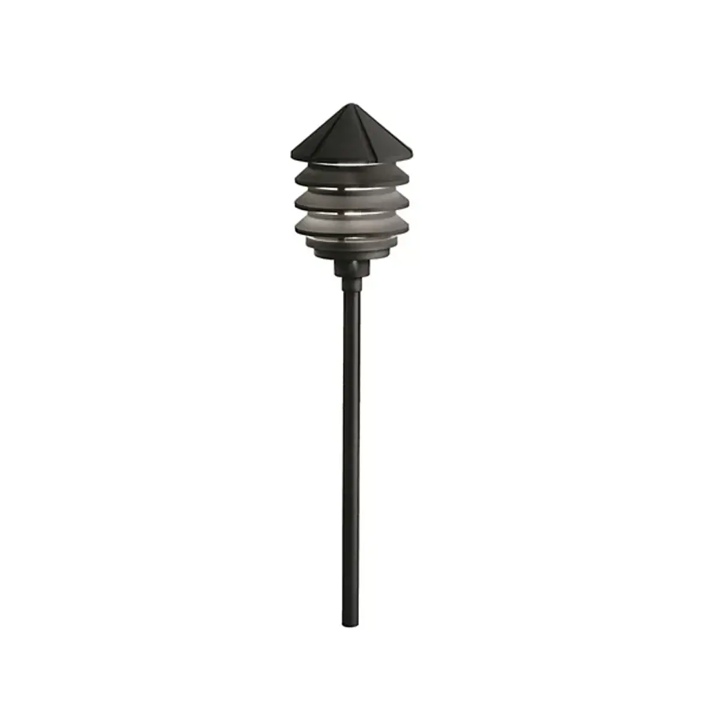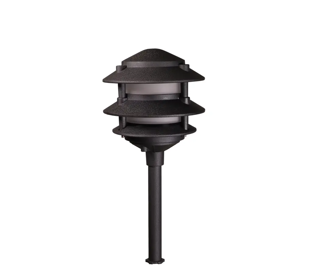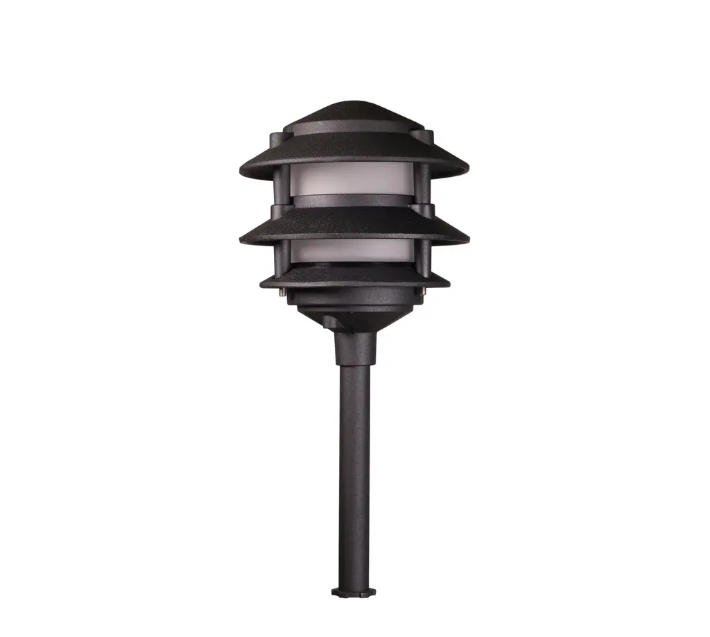 This low-voltage Pagoda Landscape Light with a 3-tier light has a timeless design. It's great for pathways, planters, and driveways. The Pagoda Landscape Light includes a 6" Height pole and ground stake.Material: Heavy Duty Cast Aluminum with powder-coated finishFinish: BlackGlass: Frosted GlassBulbs: LED 12V JC Bi-Pin G4 3W Included (Can be used with a G4 12V 50W Max)Wire Length: 14"Ground Spike IncludedWire Nuts and Connectors are not included.