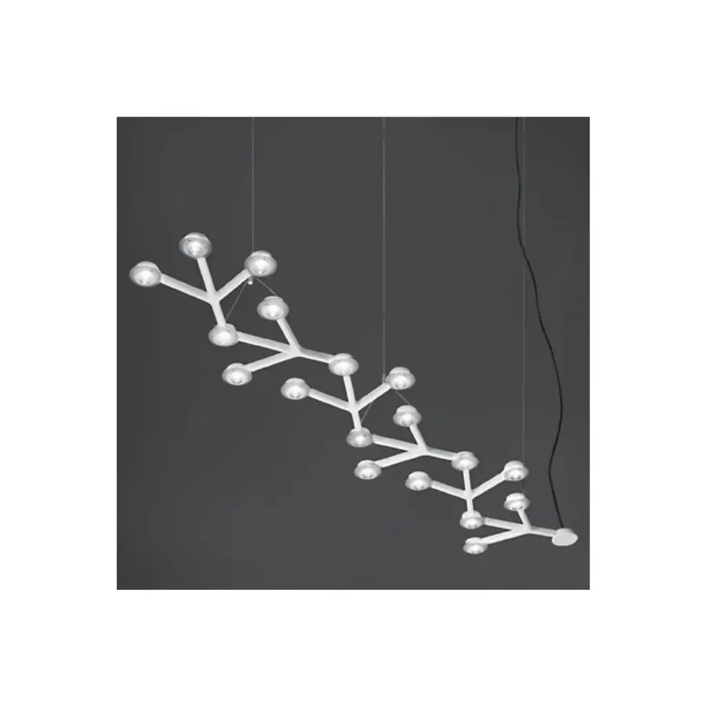 A contemporary fixture with sci-fi themes, the Artemide LED Net Line 125 Suspension utilizes energy efficient LEDs and a futuristic shape to create a web of light. Each LED "pod" features a methacrylate diffuser that adds warmth to this space-age light. Great for over long, rectangular tables.