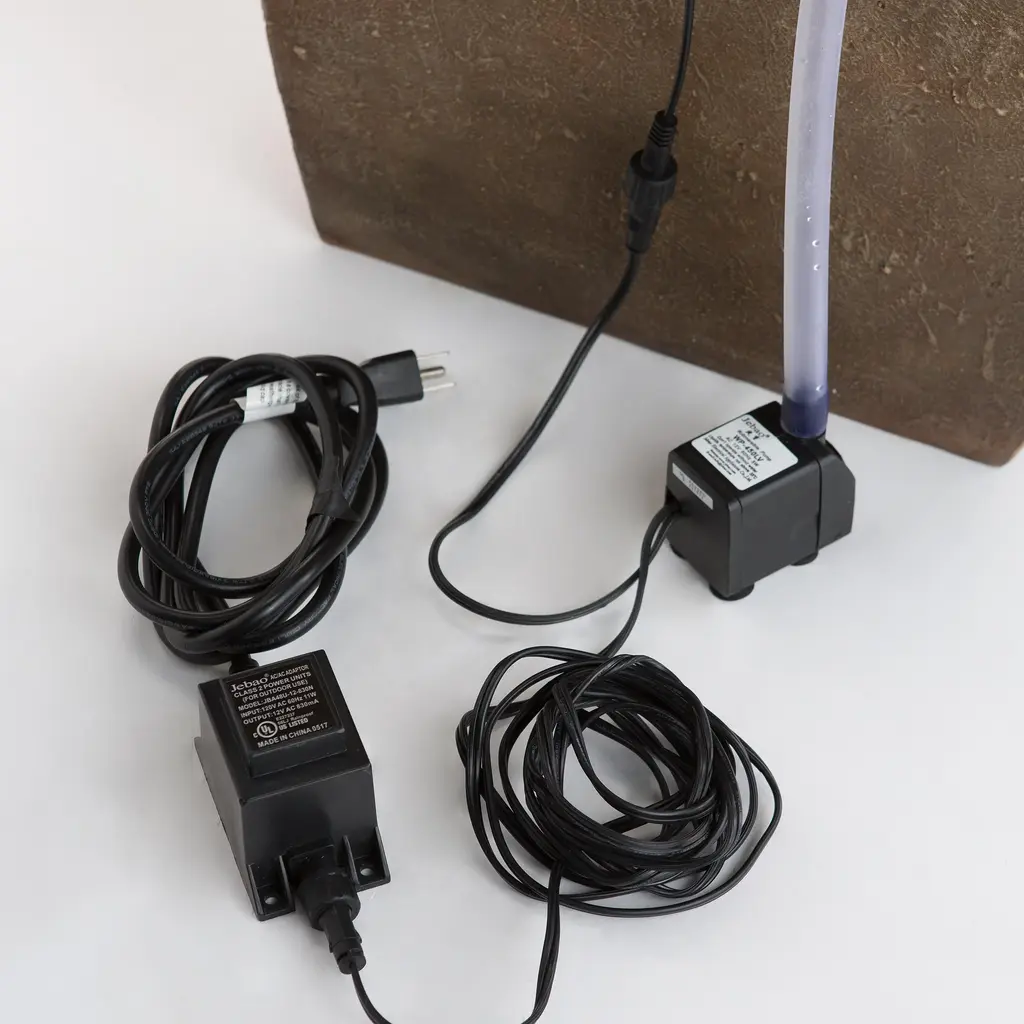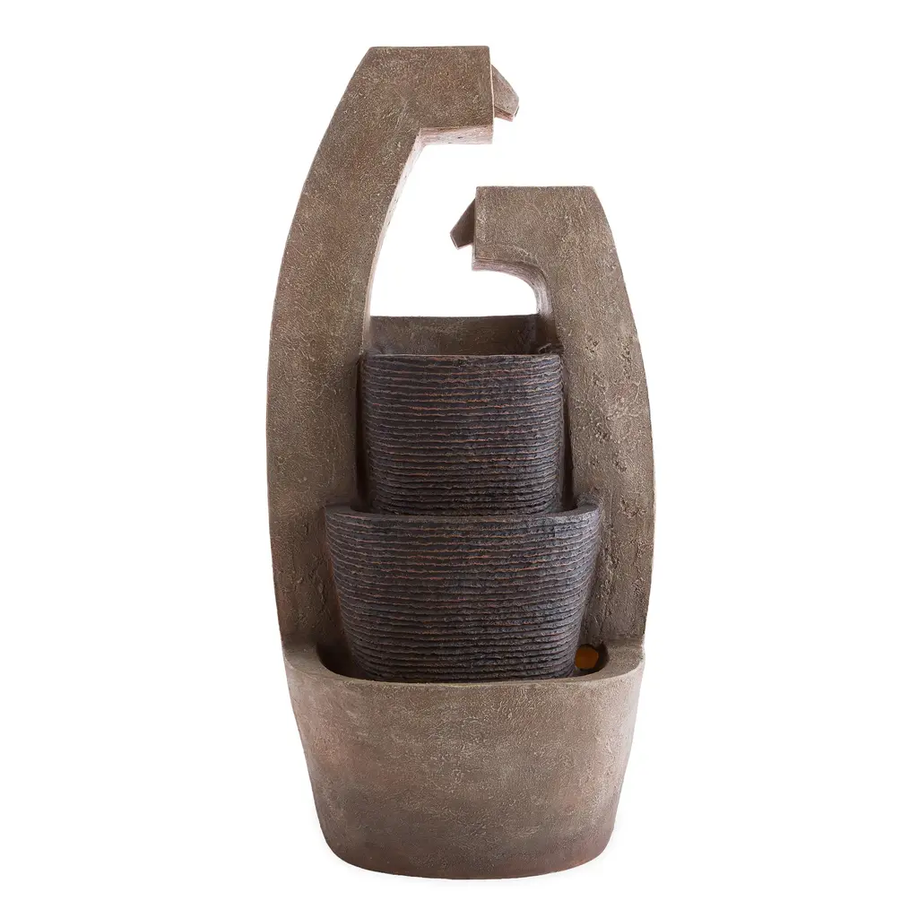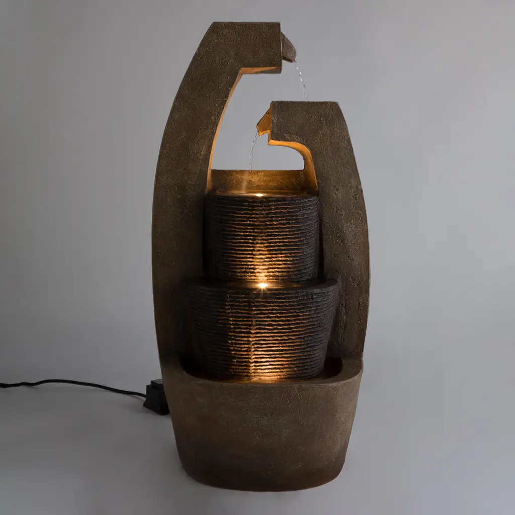 Decorate your indoor or outdoor spaces with this unique Sculptural Fountain. The modern design incorporates a pair of stone-like columns through which water flows to spill down into three tiers of basins. The first two basins have a ribbed surface that adds sparkle to the water as it flows over the hills and valleys and into the capture basin at the bottom. A quiet recirculating pump keeps the water flowing and LED lights within each tier add drama after dark. A stunning addition to a front porch, office, sun room or out in the garden. Enjoy this treat for the eyes and ears or give it as a unique and thoughtful gift.