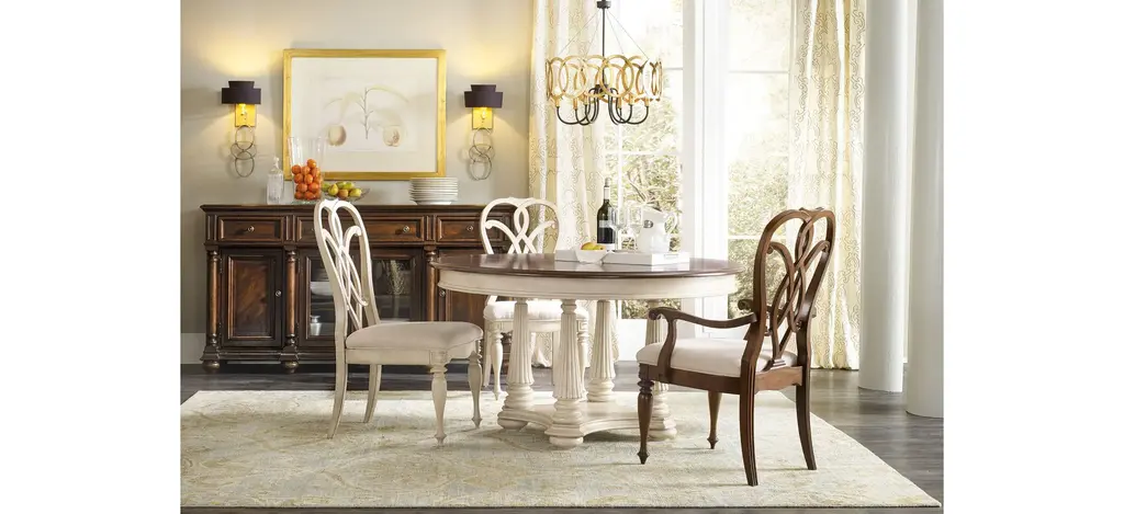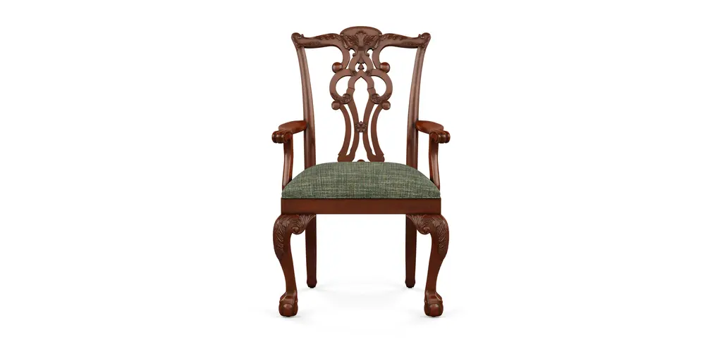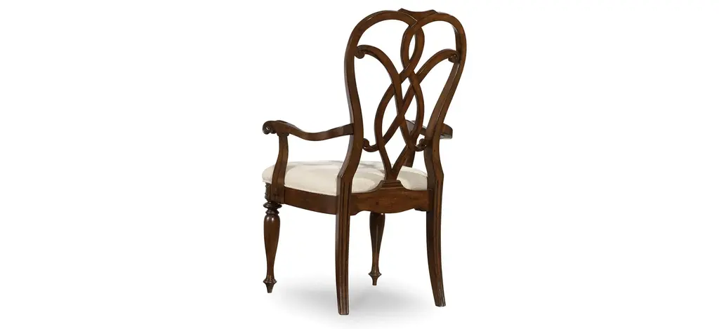 The interlocking ribbon- motif fretwork on the Leesburg splatback upholstered-seat arm chair will give a stylish and romantic flair to all your special occasions. When mixed with the Leesburg dining table finished in the deep, rich traditional color featuring cathedral and swirl mahogany veneers, your space will exude gracious hospitality.