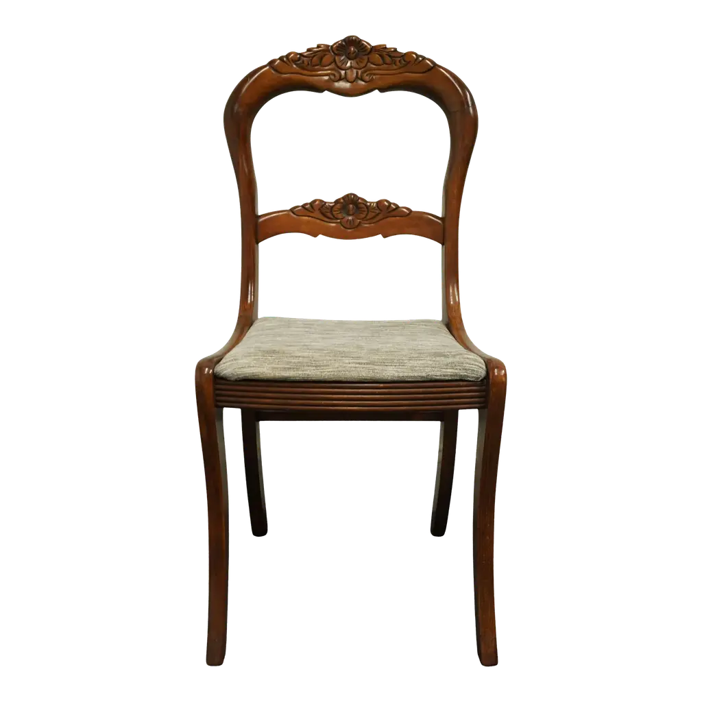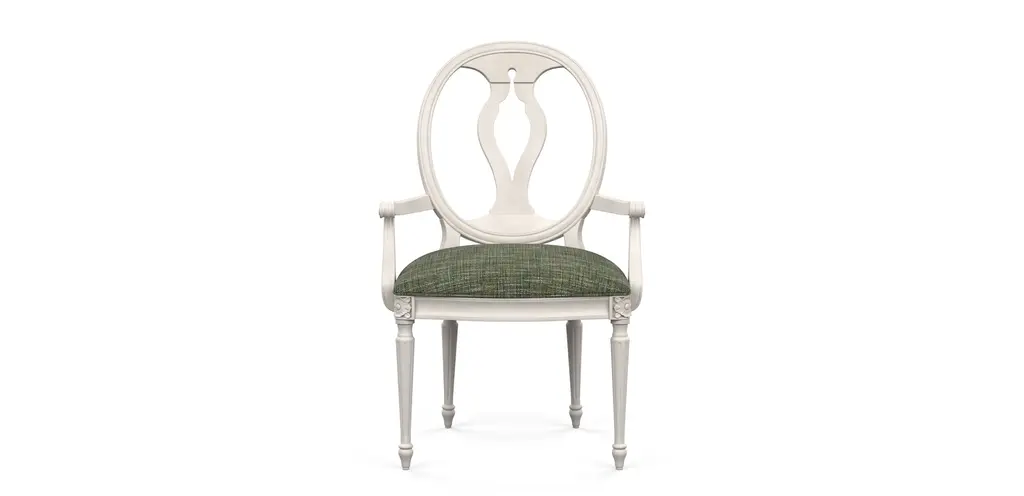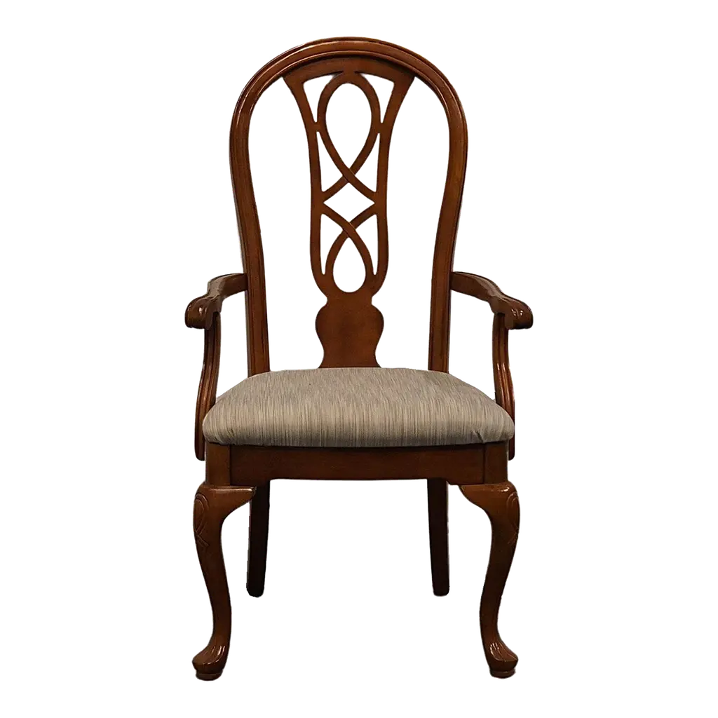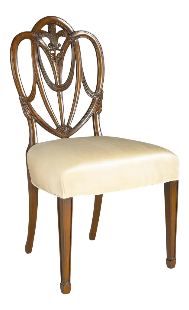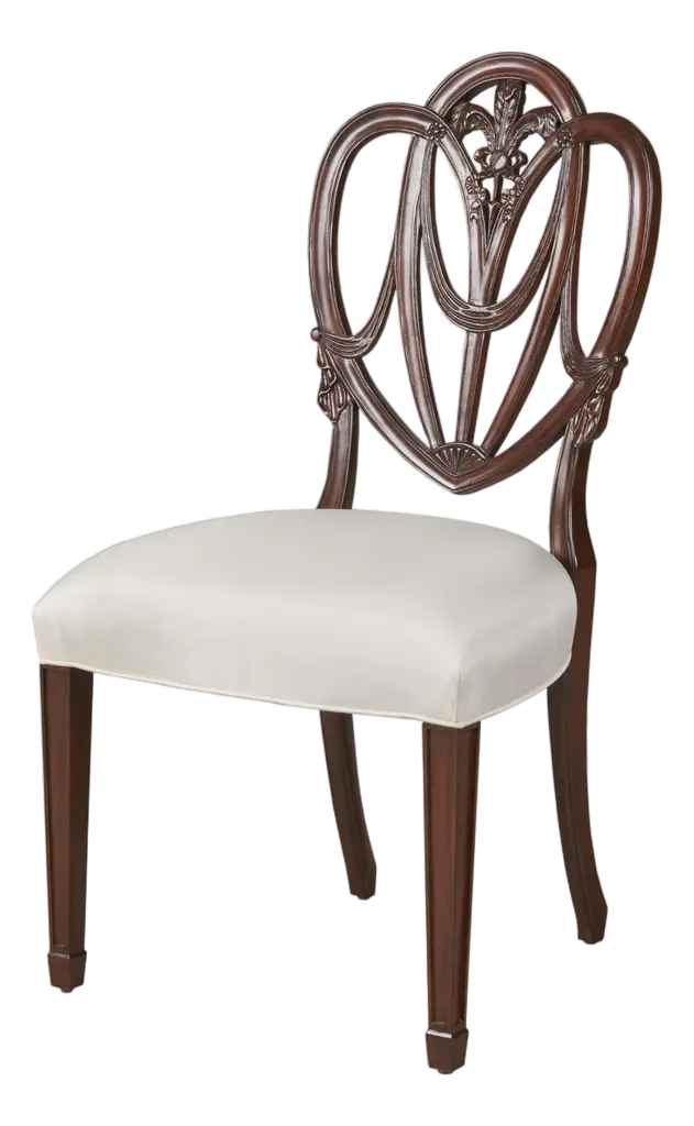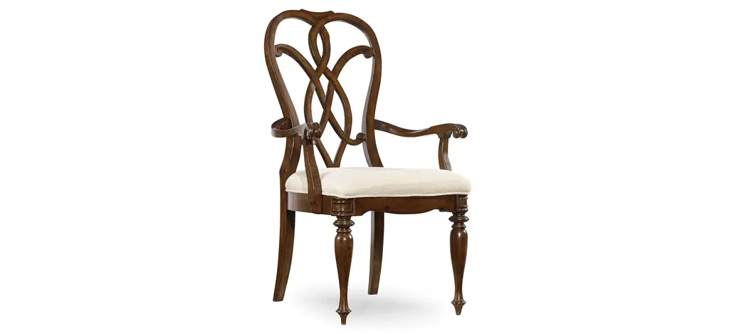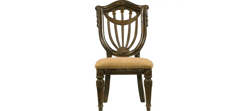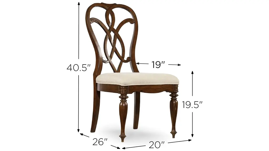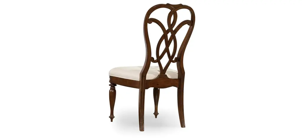 The interlocking ribbon- motif fretwork on the Leesburg splatback upholstered-seat side chair will give a stylish and romantic flair to all your special occasions. Crafted of exquisite Mahogany Veneers, the chair features a rich finish with elegant cathedral and swirl mahogany veneers with light physical distressing for a casual appeal. Seat and back upholstery is a cotton-polyester blend in an alabaster color.